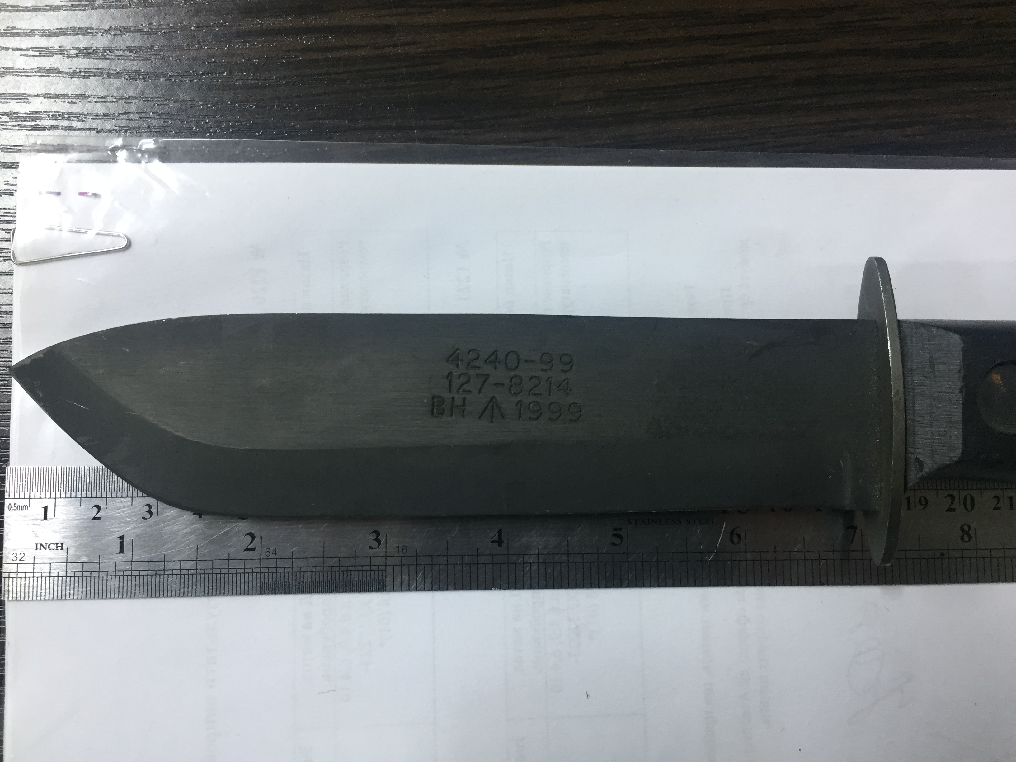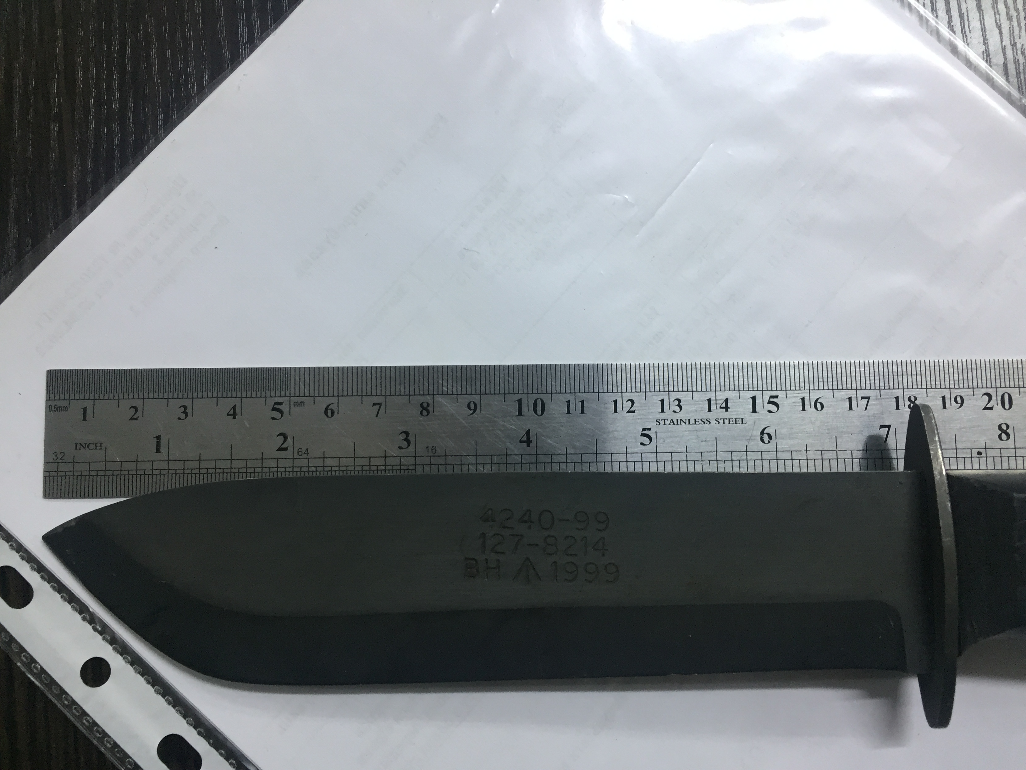 Доброго! На мой взгляд, хороший официальный нож, MOD Survival knife. Клеймо на клинке отличается от тех, что есть в сети, коммерческие идут вообще без клейма. Насколько знаю, их производили и производят J. Adams (Sheffield), Joseph Rodgers (Sheffield, сейчас часть Egginton Group), Wilkinson Sword. По исполнению самого ножа предположу, что это Адамс, а ВН на клинке может означать клеймо соответствия твердости по Бриннелю (Brinnel Hardness), но 100% утверждать не буду. По цене на зарубежных площадках за них просят около 80-90 долларов, в зависимости от состояния, наличия ножен, года выпуска и т.д. Может, камрады еще подскажут. С уважением,
