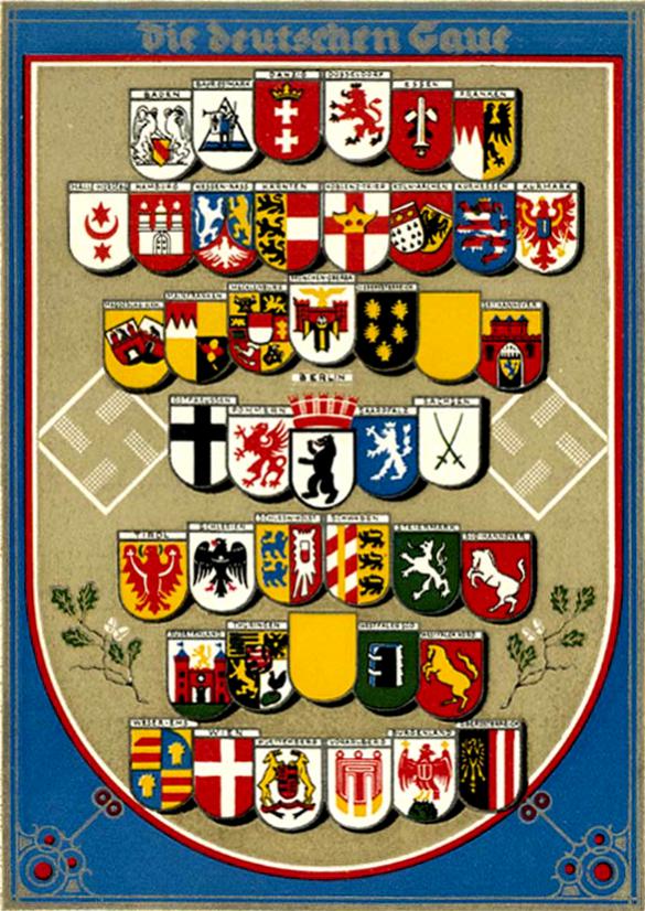 Открытка 1939 года с подборкой гербов королевств, герцогств и отдельных городов. Примечательно, что шестиконечную звезду и полумесяцы, нередко встречающиеся в геральдике, нацисты не тронули: