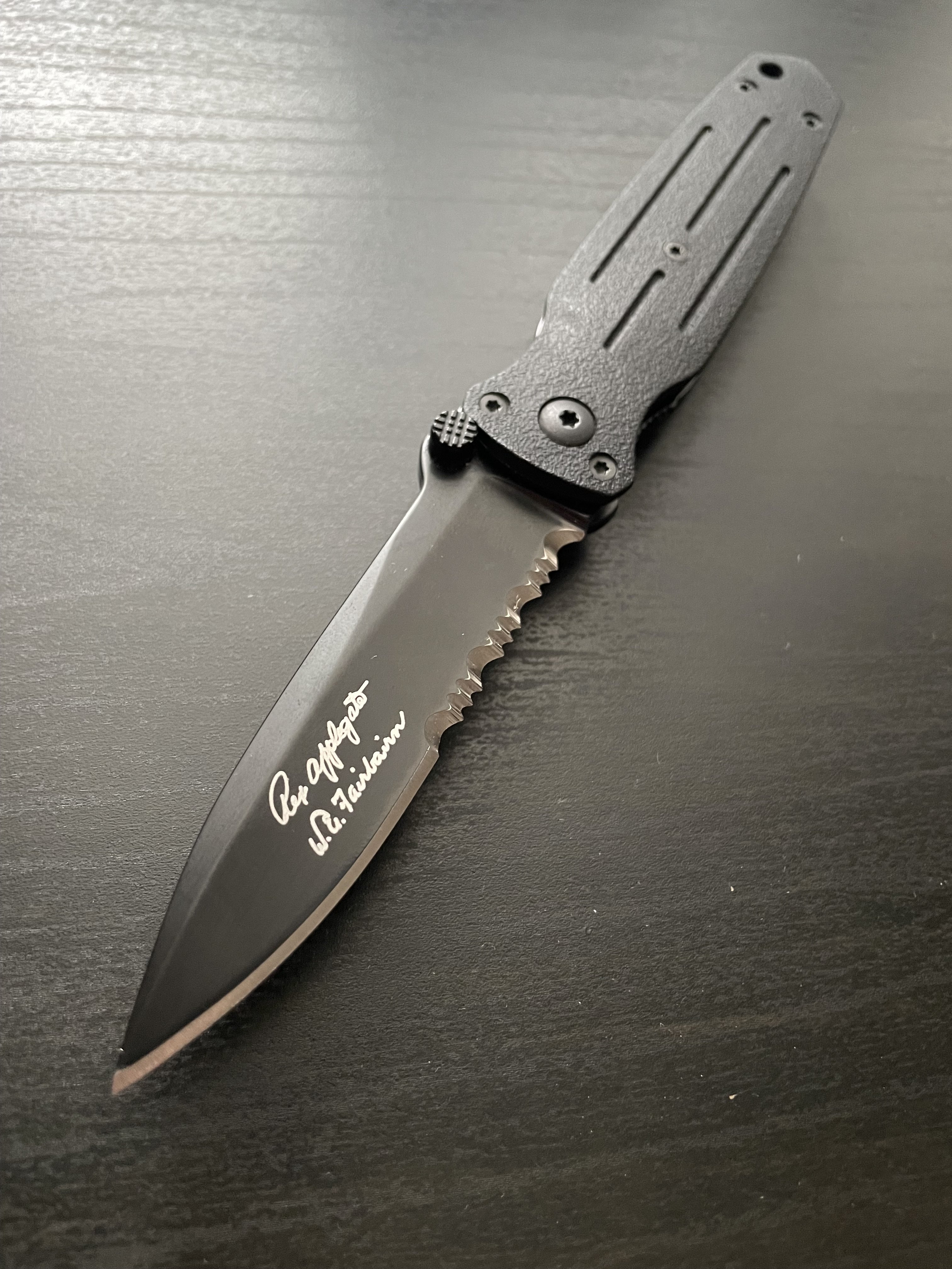 Складана версія легендарного дагера. Прекрасна ергономіка, упор шпеньками в корпус, клинок 75 мм - легенда у вашій кишені. Знято з виробництва. Новий без коробки.