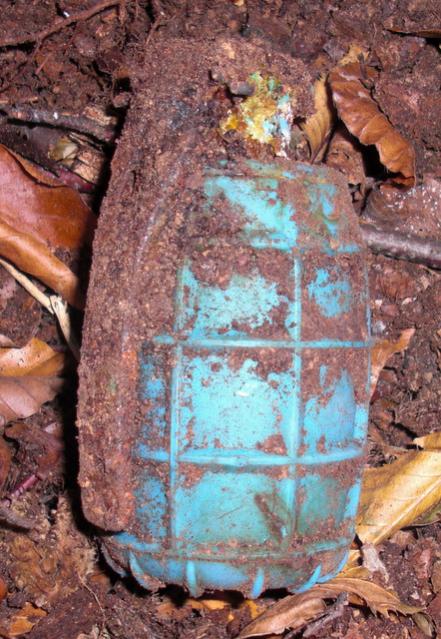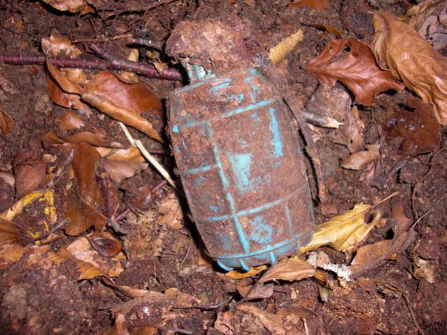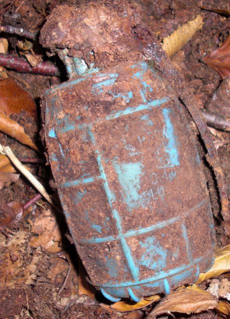 Граната ДМ58 учебная(голубой цвет),осколочная,оборонительная.Состояние хреновое,правильно что выкинули,разлет осколков 150 м. По собственному опыту скажу что эта хреновина завернутая в осколочном бронежелете,пробивает его( 10 слоев кеврала)