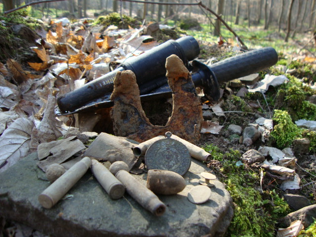 Как-то так сегодня прошёлся,попалась думаю конина,да ещё золотишка немного.Повстречал в лесу молодого байкера местного,разговорились.Оказалось то-же любитель походить попикать.Что самое-то интересное,это то ,что он был на моём старом выбитом месте.И вытащил пару недель назад из ячейки карабин М1 кал. 30.заряжен и с двумя полными магазинами,плюс две лимонки и Кольт.Глубина залегания примерно 50 см.Было завалено камнями и грунтом.Говорит,сохран хороший даже брунирунг на метале заметен,древко тоже целое. Блин,два раза там был,лесок у дороги 300х100метров и ячейку обходил эту два раза,но сигнал не словил.Вот такие пироги.Ну да ничего,главное,что не пропало зря.Ну а на закуску мы с ним прокатились за город на склон горы,где в 44ом году упал сбитый Focke Wulf-190.,который он обнаружил.Короче в основном хлам,но сливки он всёже собрал,это карманные серебр.часы,газмаске, два ремня и ещё различная жбонь.Но попробывать покапать ещё стоит,т.к невсё разрыто.