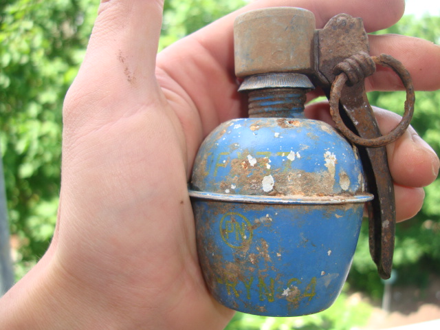 60's to 90's french training OFx-37 As shown above, the blue and blue/black grenades are inert when no fuze is fitted. These have the body filled with dry chalk, and are used as training grenades. When the fuze shatters the body, the chalk creates a white dust-cloud which simulates detonation.