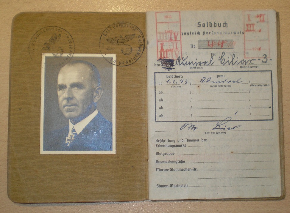 Admiral Otto Ciliax Born: 30 Oct 1891 in Neudietendorf, Thuringia (Thüringen) Died: 12 Dec 1964 in Lübeck Promotions: Fähnrich zur See (15 Apr 1911); Leutnant zur See (27 Sep 1913); Oberleutnant zur See (22 Mar 1916); Kapitänleutnant (29 Jun 1920); Korvettenkapitän (01 Oct 1928); Fregattenkapitän (01 Oct 1933); Kapitän zur See (01 Jul 1935); Konteradmiral (01 Nov 1939); Vizeadmiral (01 Jun 1941); Admiral (01 Feb 1943) Career: Entered the Navy as a Seekadett, Attended Basic-Training and on Board the Heavy Cruiser ‘Victoria Louise’ (01 Apr 1910-31 Mar 1911) Attended Naval-School and Special-Briefings (01 Apr 1911-30 Sep 1912) On Board the Liner ‘Hannover’ (01 Oct 1912-30 Nov 1915) Submarine-Training (01 Dec 1915-31 Dec 1915) Watch-Officer on the Torpedo-Boat ‘T 37’, Submarine-Acceptance-Command (02 Jan 1916-20 Feb 1916) Construction-Indoctrination ‘U 52’, Submarine-Battalion (21 Feb 1916-15 Mar 1916) Watch-Officer on the Submarine ‘U 52’ (16 Mar 1916-14 Oct 1917) Placed to the Disposal of the II. Submarine-Flotilla (15 Oct 1917-11 Nov 1917) Detached to the Submarine-School (12 Nov 1917-05 Dec 1917) Placed to the Disposal of the II. Submarine-Flotilla (06 Dec 1917-23 Jun 1918) Commandant of the Submarine ‘UB 96’ (24 Jun 1918-22 Jul 1918) Placed to the Disposal of the Submarine-Acceptance-Command (25 Jul 1918-10 Aug 1918) Placed to the Disposal of the Submarine-School (11 Aug 1918-24 Aug 1918) 2nd Adjutant of the Inspection of Submarines (25 Aug 1918-23 Sep 1918) Commandant of the Submarine ‘UC 27’ (24 Sep 1918-20 Jan 1919) Placed to the Disposal of the Inspection of Submarine Affairs (21 Jan 1919-14 Mar 1919) Commandant of the Torpedo-Boats ‘T 92’ and ‘T 107’ (15 Mar 1919-30 Nov 1919) Commandant of the Torpedo-Boat ‘T 181’ (01 Dec 1919-18 Jan 1920) Commandant of the Torpedo-Boats ‘T 140’ and ‘T 145’ (19 Jan 1920-31 Dec 1920) Placed to the Disposal of the Chief of the Naval-Station of the Baltic Sea (01 Jan 1921-11 Jul 1921) Detached to the Naval-Archives (12 Jul 1921-24 Mar 1922) Advisor in the Reichs Naval Service Office Hamburg (25 Mar 1922-31 Jan 1923) Advisor in the Reichs Naval Service Office Bremen (15 Feb 1923-20 Mar 1923) Company-Leader and Teacher at the Naval-School Mürwik (21 Mar 1923-30 Sep 1923) Commandant of the Torpedo-Ship ‘G 8’, I. Torpedo-Boat-Flotilla (01 Oct 1923-23 Mar 1924) Taken Sick and Granted Leave (24 Mar 1924-10 Aug 1924) With the Welfare-Department of the Naval-Station of the Baltic Sea (11 Aug 1924-29 Mar 1925) Commandant of the Torpedo-Boat ‘S 18’, I. Torpedo-Boat-Flotilla (30 Mar 1925-22 Sep 1926) Chief of the I. Torpedo-Boat-Half-Flotilla (23 Sep 1926-26 Sep 1928) Advisor in the Fleet-Department, Naval-Command (01 Oct 1928-23 May 1929) 1st Admiral-Staff-Officer in the Staff of the Commander of the Sea-Force of the Baltic Sea (24 May 1929-31 Dec 1929) 1st Admiral-Staff-Officer in the Staff of the Commander of the Reconnaissance-Force (01 Jan 1930-23 Sep 1931) Advisor in the Training-Department of the Naval-Command (25 Sep 1931-30 Sep 1932) Advisor in the Fleet-Department of the Naval-Command (01 Oct 1932-28 Sep 1934) Chief of the Fleet then Operations Department of the Naval Command (from 11/01/1936, OKM) (29 Sep 1934-21 Sep 1936) Commandant of the Armoured-Ship ‘Admiral Scheer’ (22 Sep 1936-30 Oct 1938) At the same time, Temporary Commander of the Sea-Force at Spain (22 Mar 1938-26 Jun 1938) Placed to the Disposal of the Commander of Armoured-Ships (01 Nov 1938-06 Jan 1939) Commandant of the Battleship ‘Scharnhorst’ (07 Jan 1939-28 Sep 1939) Placed to the Disposal of the Commanding Admiral of the Naval-Station of the North Sea (29 Sep 1939-04 Dec 1939) Chief Of Staff of Naval-Group-Command West (05 Dec 1939-05 Jun 1941) Commander of Battleships (16 Jun 1941-02 Jun 1942) At the same time, Commander of the Baltic Fleet (21 Sep 1941-21 Oct 1941) Inspector of Torpedo Affairs (26 Jun 1942-21 Mar 1943) Commander-in-Chief of the Naval-High-Command Norway (04 Mar 1943-25 Apr 1945) In Captivity (25 Apr 1945-24 Feb 1946) Released (24 Feb 1946) Decorations & Awards: - Ritterkreuz (105): am 21.03.1942 als Vizeadmiral und Befehlshaber der Schlachtschiffe - Deutsches Kreuz in Gold: am 20.11.1941 als Vizeadmiral und Befehlshaber der Schlachtschiffe - 1914 EK I: 03.11.1916 - 1914 EK II: 13.06.1916 - RK II. Klasse des Herzogl. Sachsen-Ernestinischen Hausordens mit Schwertern - k.u.k. Österr. Militär-Verdienstkreuz III. Klasse mit der Kriegsdekoration: 25.03.1917 - U-Bootskriegsabzeichen, 1918 - Ehrenkreuz für Frontkämpfer : 20.10.1934 - Wehrmacht-Dienstauszeichnung IV. bis I. Klasse: 02.10.1936 - Komturkreuz des Kgl. Spanisch-Marrokanisches Mehdauia-Orden: 05.03.1938 - Komturkreuz des Kgl. Ungar. Verdienstorden: 20.08.1938 - Silberne Plakette des Deutschen Auslandsinstitutes: 00.00.1939 - Medalla de la Campaña de España - Spanienkreuz in Gold mit Schwertern: 06.06.1939 - Kgl. Spanisches Marineverdienstkreuz III. Klasse in Weiss: 21.08.1939 - Kgl. Spanisches Marineverdienstkreuz III. Klasse in Gold: 21.08.1939 - Spange zum EK I: 00.04.1940 - Spange zum EK II: 00.01.1940 - Komturkreuz des Kgl. Italien. Ordens der Krone: 11.03.1941 - Flottenkriegsabzeichen: 00.00.1941 - Wehrmachtbericht: 13.02.1942