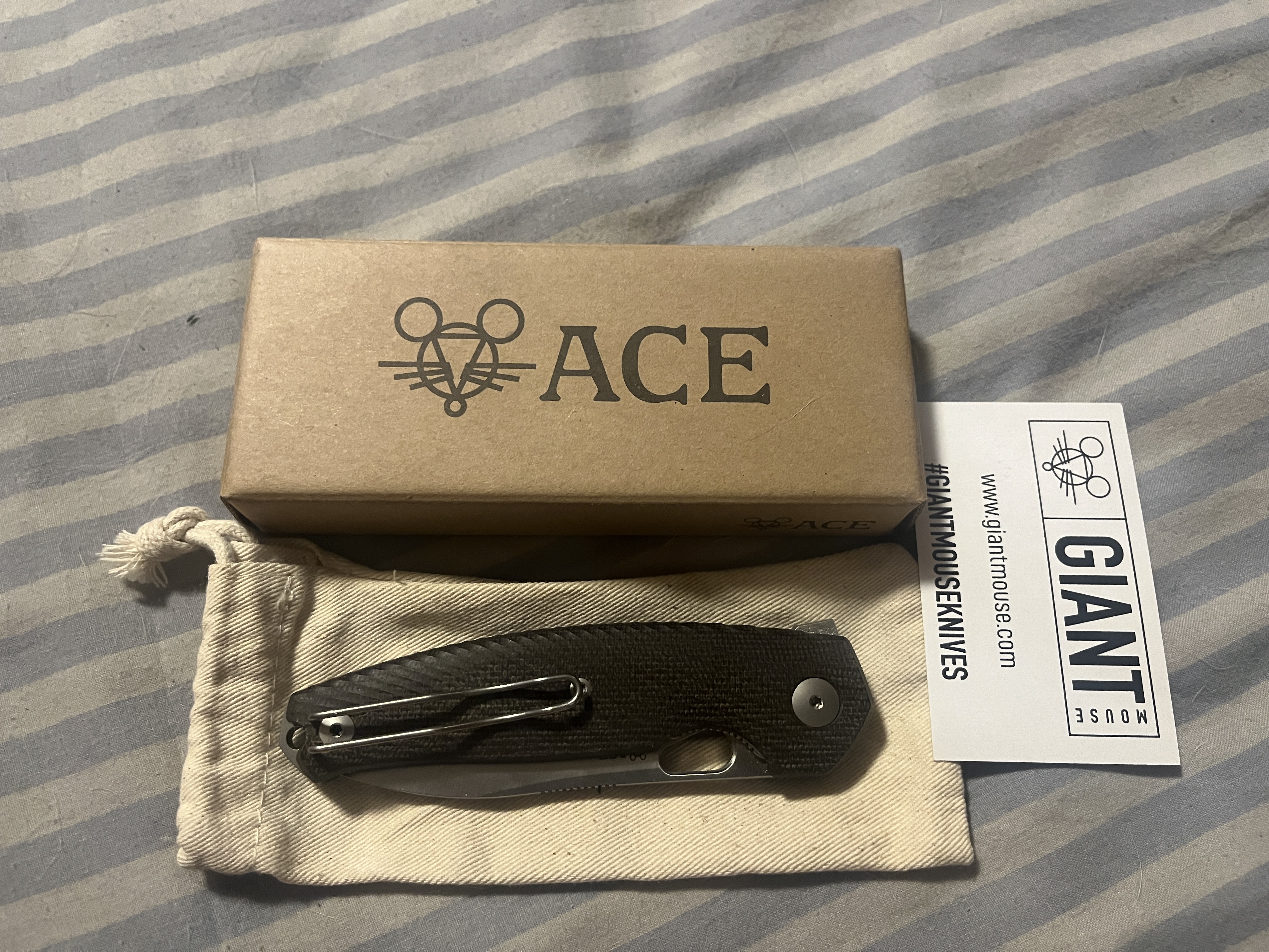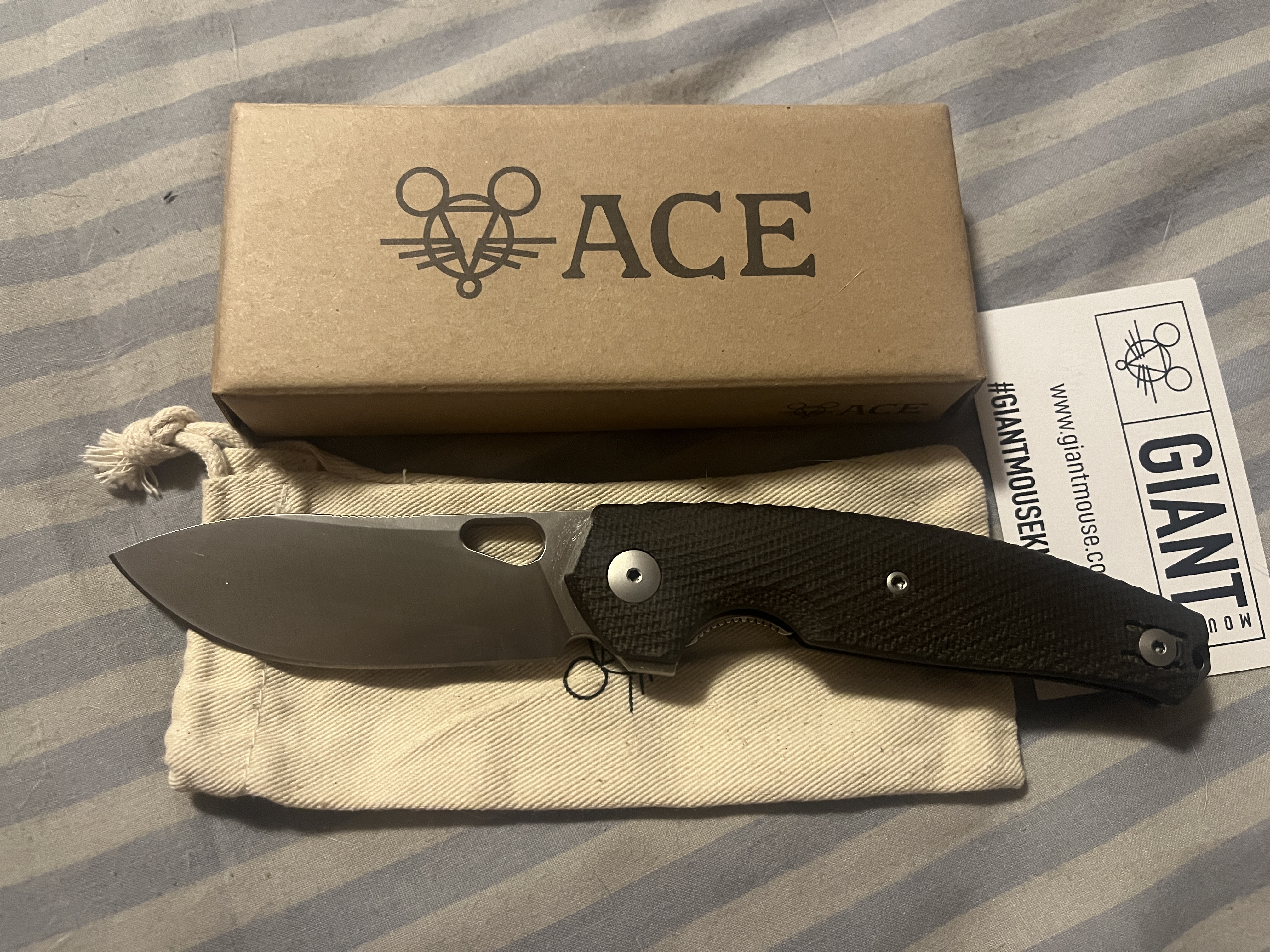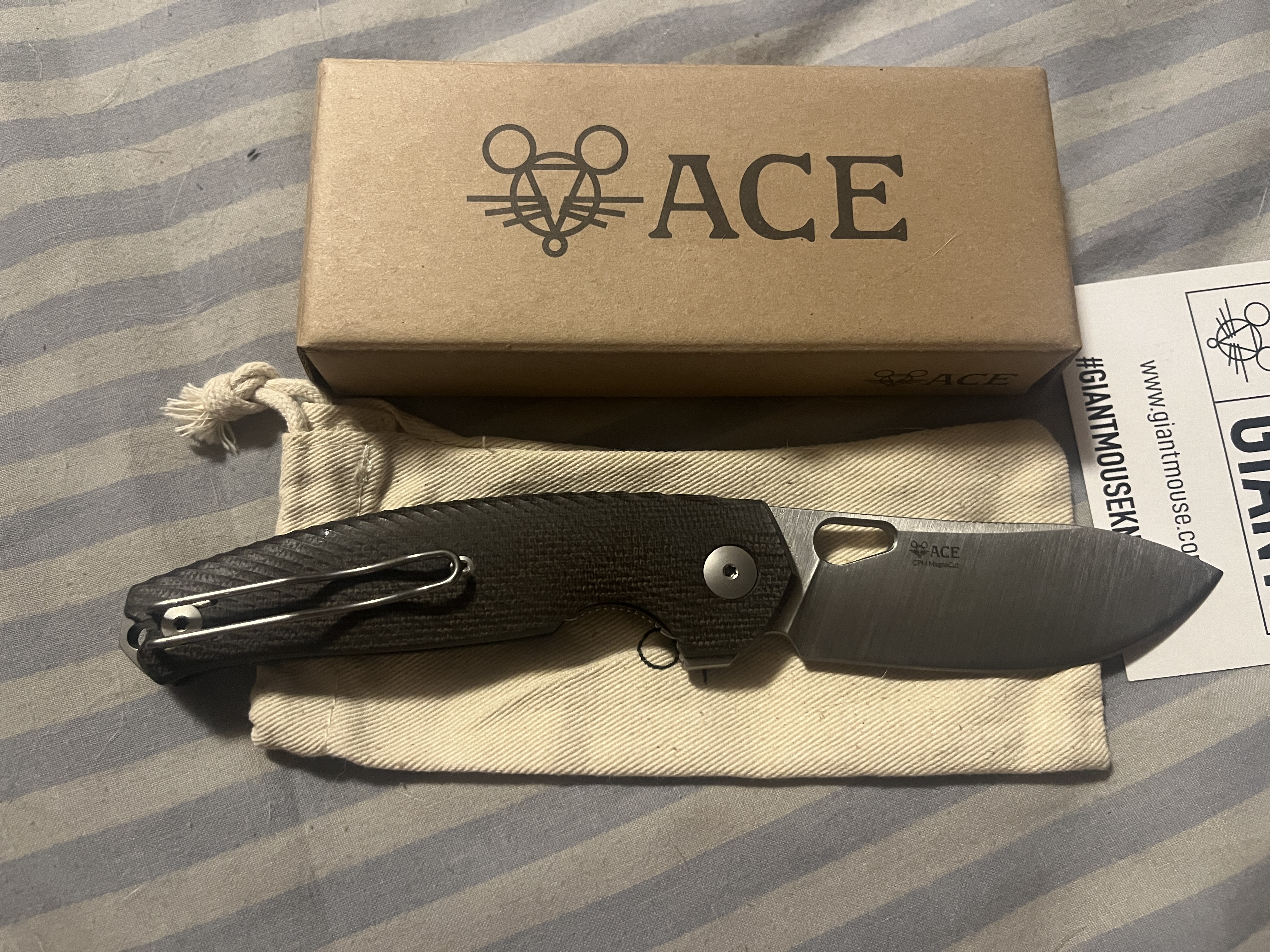Giantmouse ace jagt Чудовий стан,повний комплект+додаткова глибока кліпса Проволочна кліпса стоїть не рідна 7300грн Сталь MagnaCut Профиль клинка Drop point Сечение клинка Full Flat Покрытие / отделка клинка Satin Фиксация клинка Liner Lock Корпус Нержавеющая сталь Механизм открытия Отверстие Рукоять Micarta Дизайнер Vox / Ansø Вес: 119 г Длина общая: 203 мм Длина клинка: 83 мм Длина рукояти: 119 мм Толщина клинка: 3,9 мм Страна изготовления: Италия