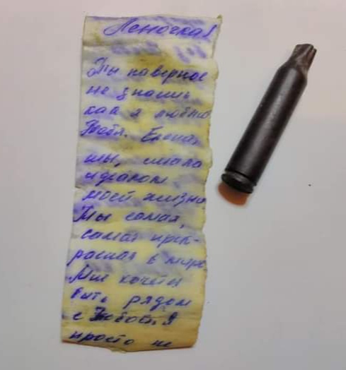 Доброго времени,камрады. В Фейсбуке натолкнулся на такие фото. Хозяин фото думает,что записка времен войны,я думаю что современная. Прошу разрешить спор) Бумага из гильзы по словам нашедшего не ломкая,размоталась насухую без проблем. Мне видится современщина, написанная шариковой ручкой. С уважением
