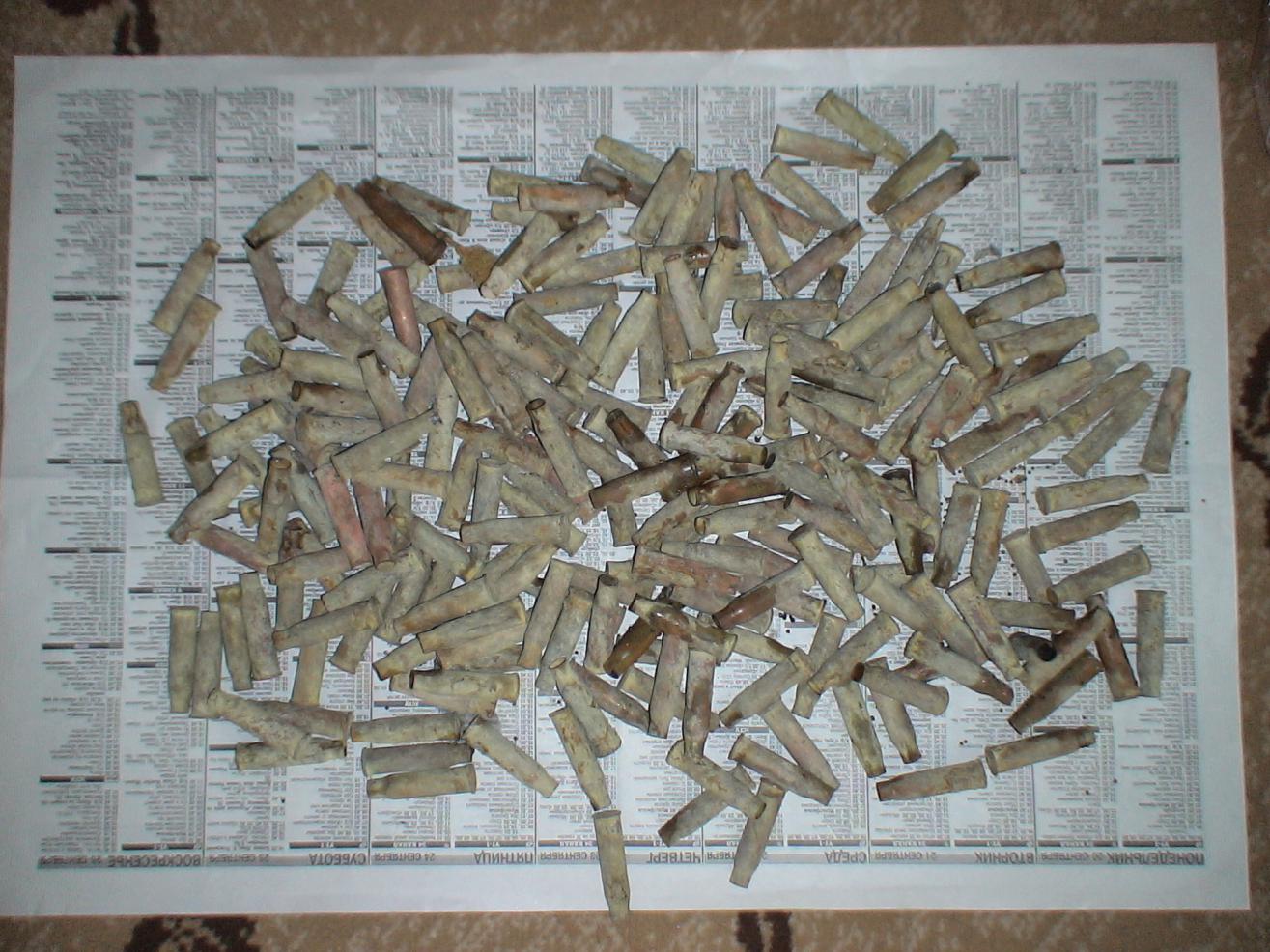 вот такая куча гильзача. сколько стоит одна гильза или весь гильзач все с НЕБИТЫМИ капсулями. 1914 года.. на горлышке на многих небольшая трещинка