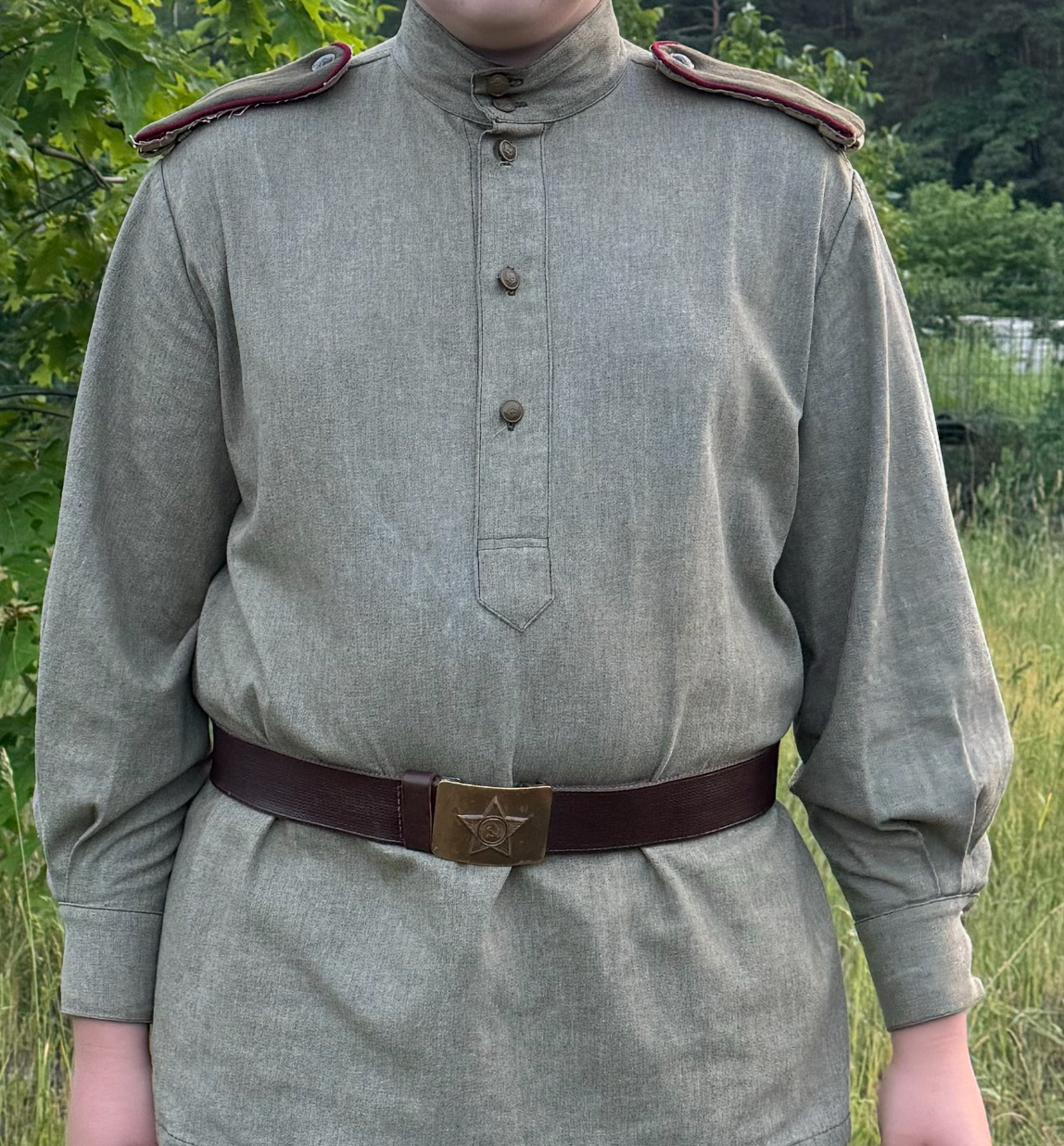 За час питання вирішилось та пришли до спільного рішення! Гімнастерка сучасно пошиву обр 1943 р. Гімнастерка зшита з тканини хб яка використовувалась 1928-1954 р. Погони репліка. Де була пошита або який клуб шив невідомо. З повагою!