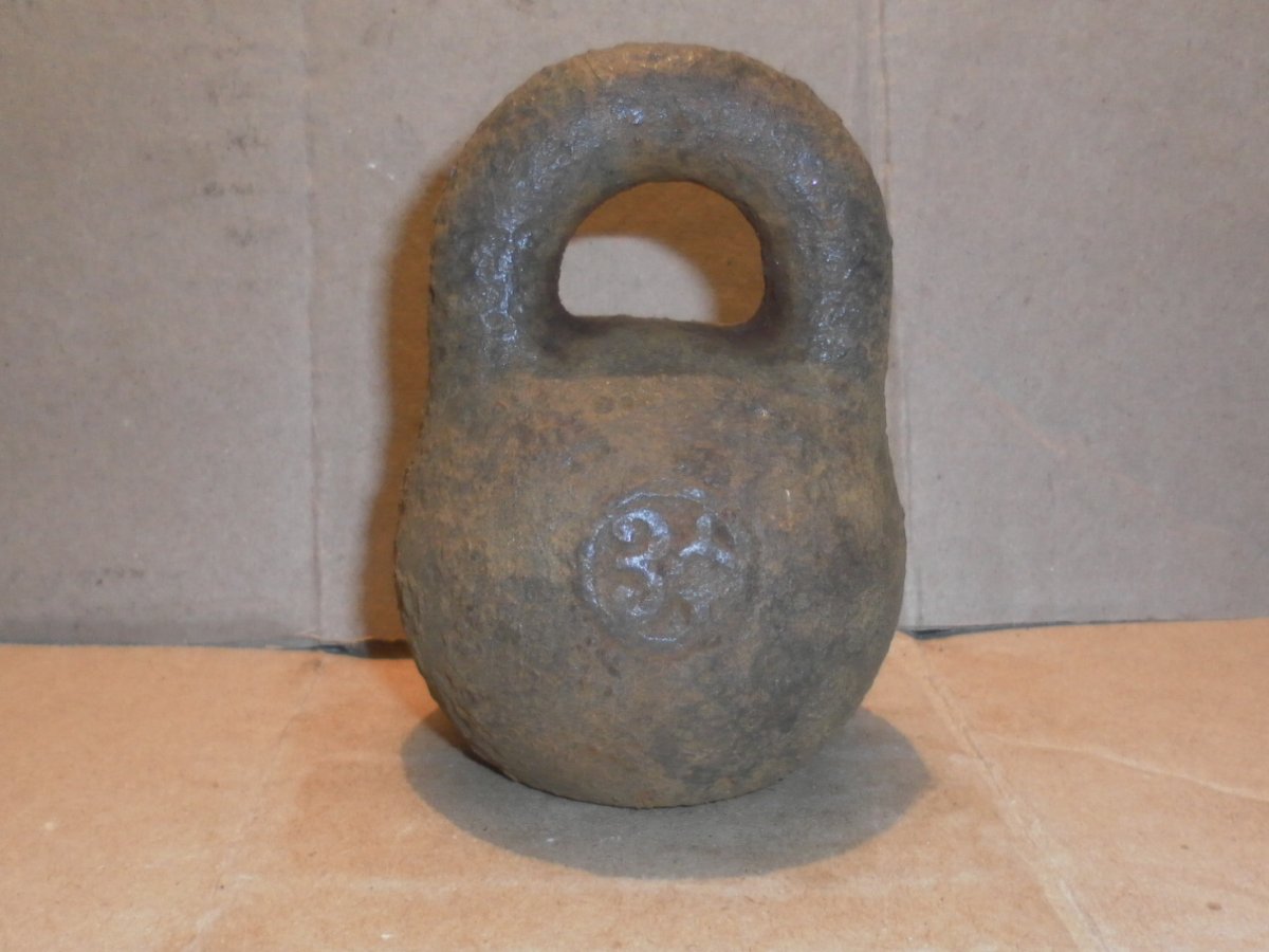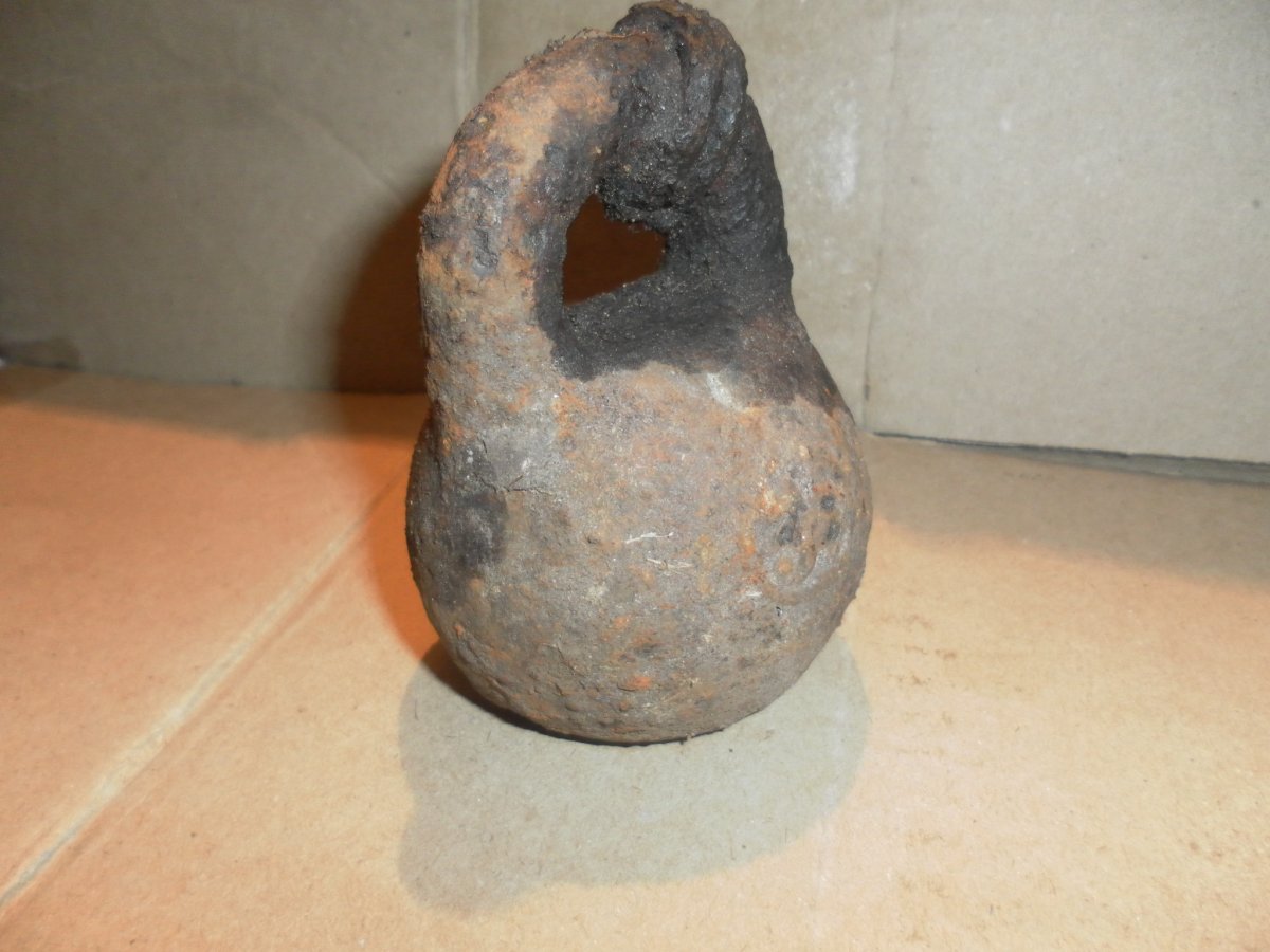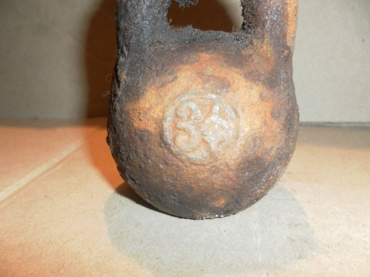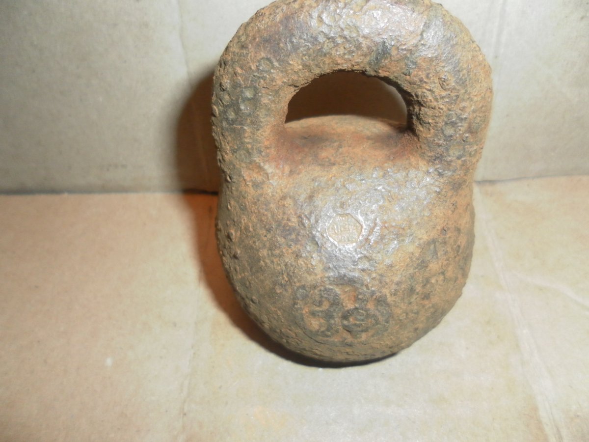 Гиря служила якорем. Обрежте веревку на дужке и чистите смело щеткой. Покажутся и клеймо медное и эмблема выделится лучше. С клеймом акуратненько. Я такую продал за 200грн. 1фунт= 453,592грамм. По клейму можно определить где она клеймилась и год.