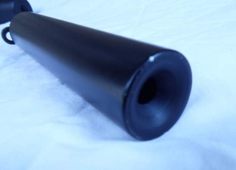 Глушитель разработан для пистолет- пулемёта, для ведения как одиночного огня, так и огня очередями. Предназначен как противовес – цевьё, для компенсации подбросов во время стрельбы очередями и удерживания аппарата более комфортным хватом. Кожух и наружная гайка из титана, внутренности из стали.