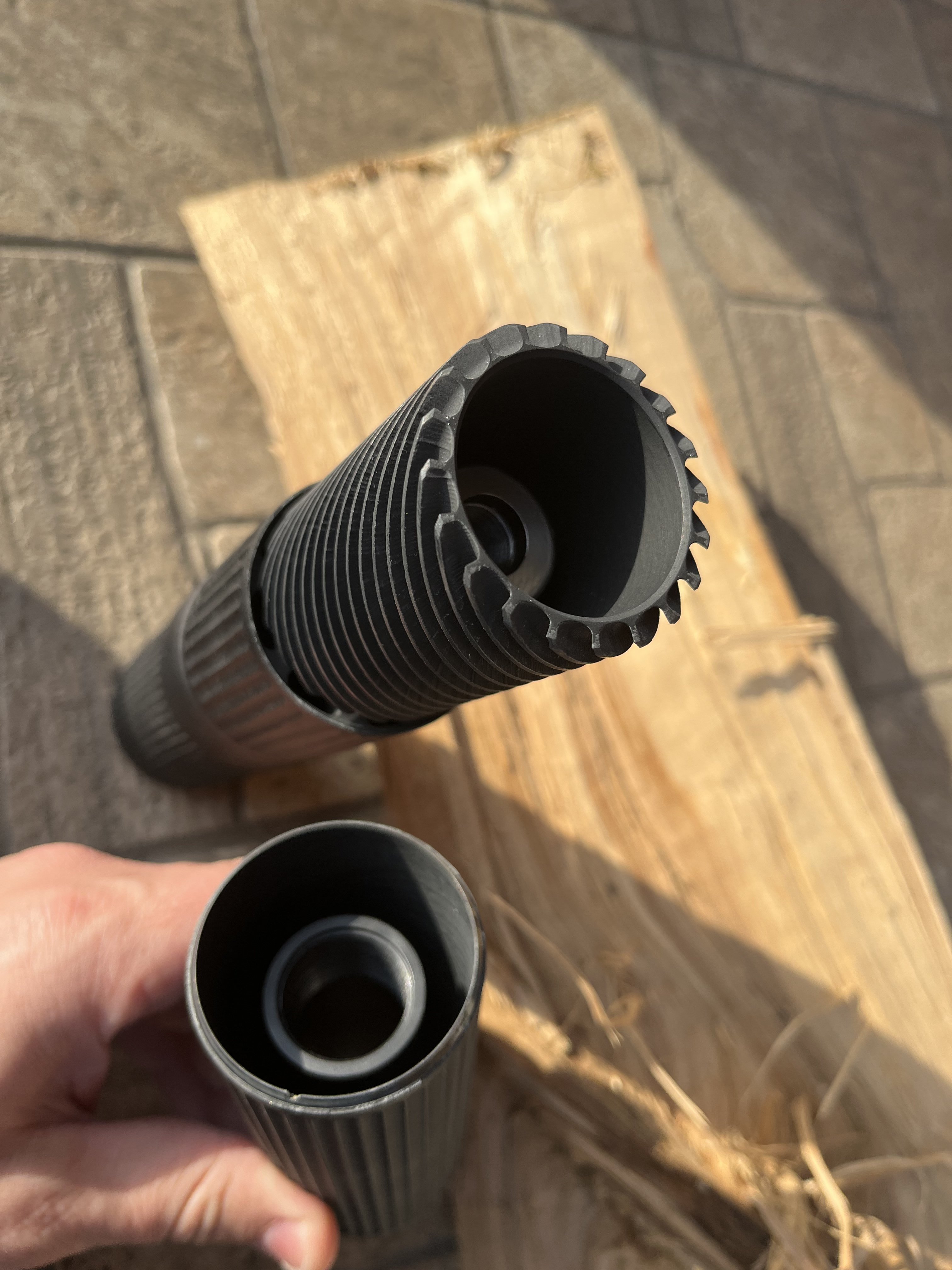 Пропоную свій глушник Zero Integral, настріл на моїй арці DB15 не більше 100 набоїв. Інтеграція майже впритул до стокової цівки DB15 - зазор 1 мм. Купувався тут на форумі ще до війни у відомого майстра. Працює дуже ефективно, має газорозгрузку. Причина продажу - перехід на BoreLock систему, один глушник на дві арки з різними довжинами стволів/цівок. Матеріал: алюміній, титан (різьбовий блок, сепаратори). Вага: 595 грам 9500 грн.