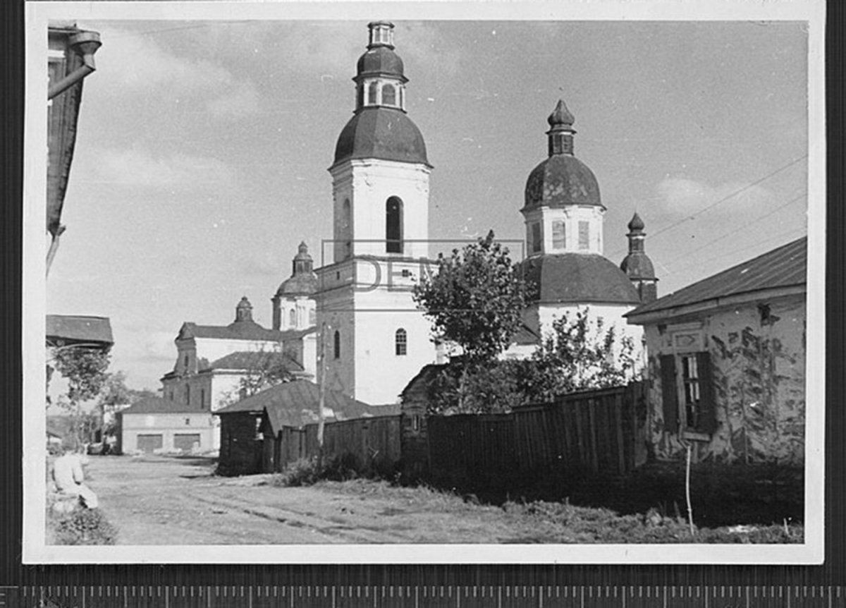 Троїцький собор. Вересень-жовтень 1941 р. Торгові ряди, що відмежовували храм від вулиці Терещенківської і Базарної площі були розібрані в 1943 році.
