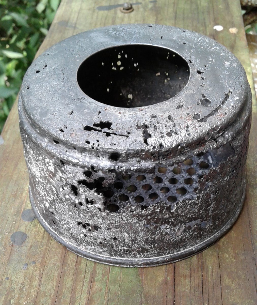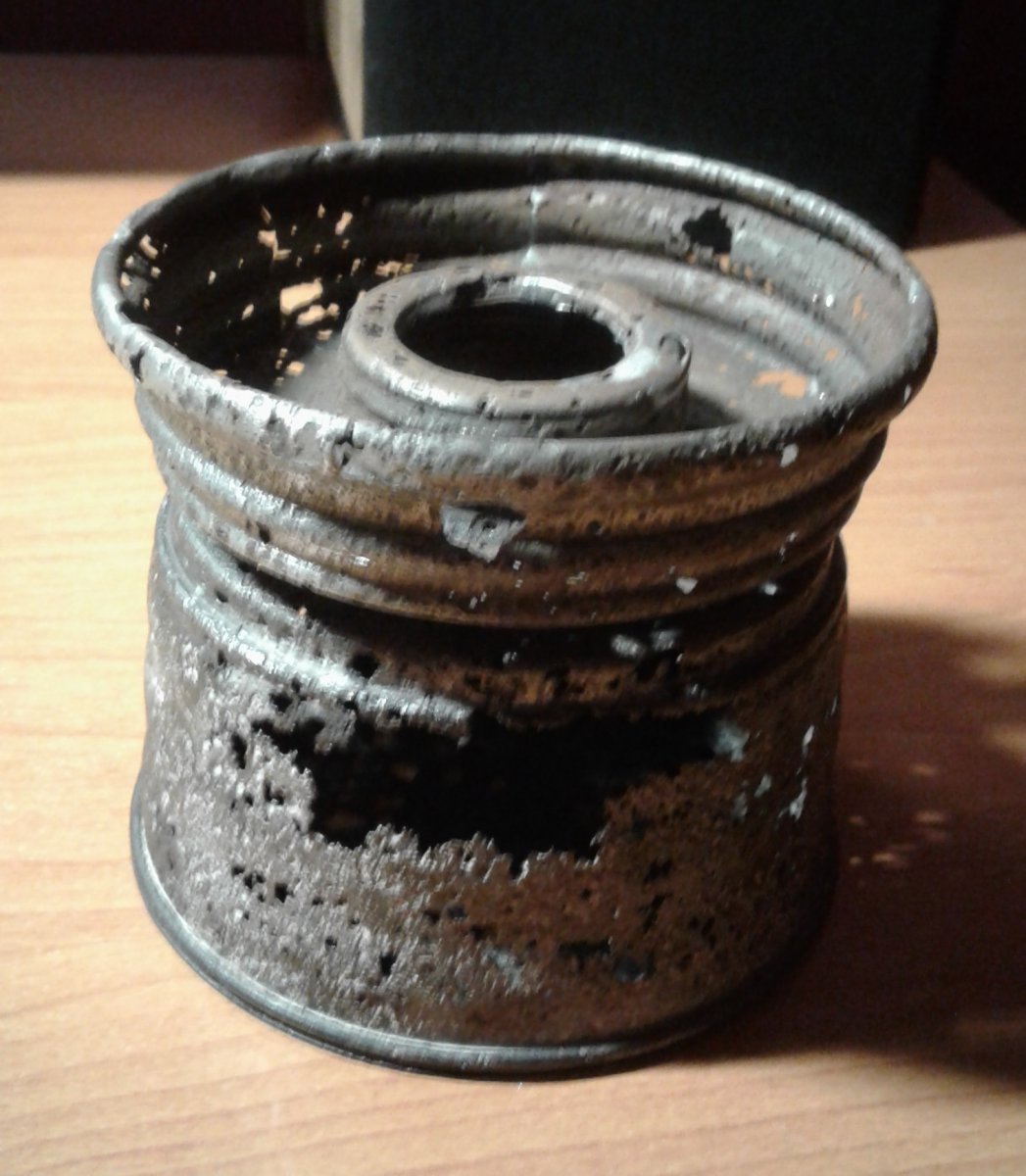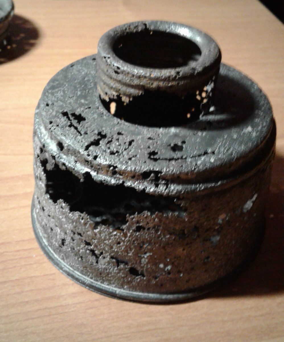 Есть еще фильтр. Развальцевал и разобрал, так как часть завальцовки отсутствовала, почистил с помощью все той же лимонной кислоты. После чистки тоже печальное зрелище, дыры от коррозии и утеря резьбы, раскрошилась. На фильтре тоже есть клеймо.