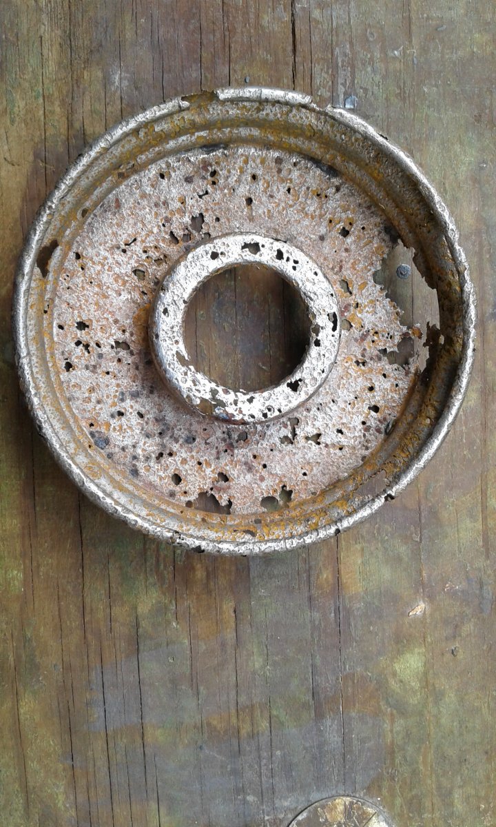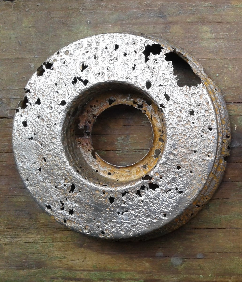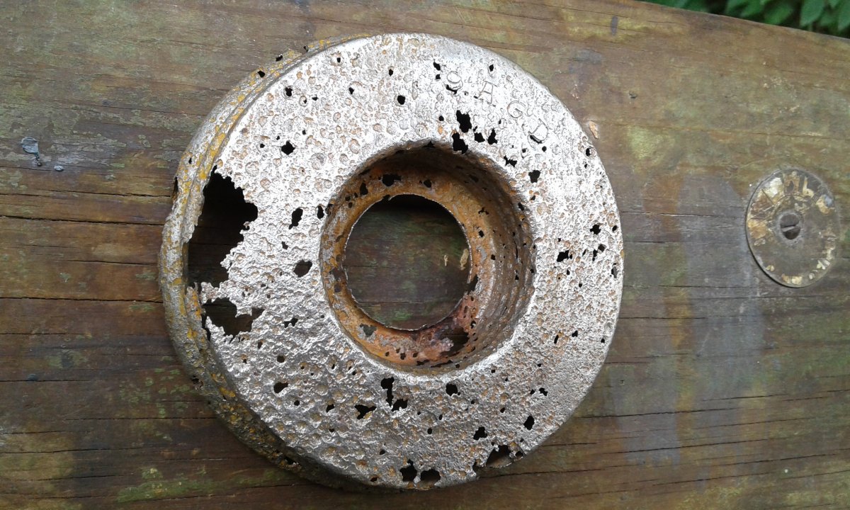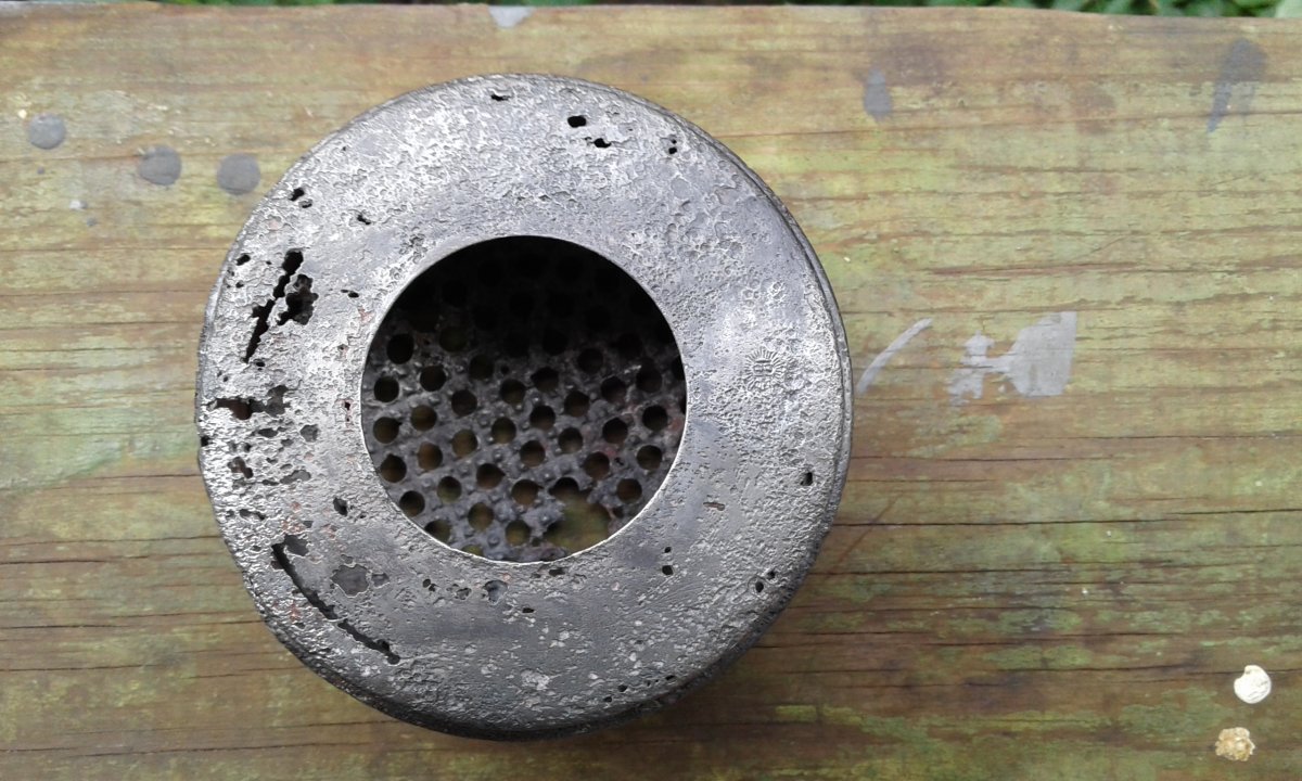 Есть еще фильтр. Развальцевал и разобрал, так как часть завальцовки отсутствовала, почистил с помощью все той же лимонной кислоты. После чистки тоже печальное зрелище, дыры от коррозии и утеря резьбы, раскрошилась. На фильтре тоже есть клеймо.