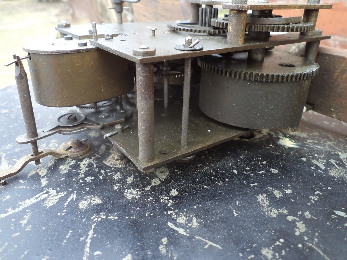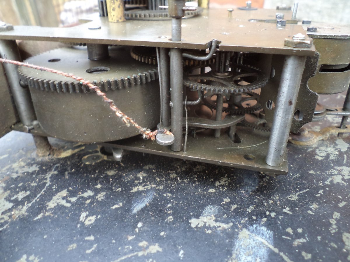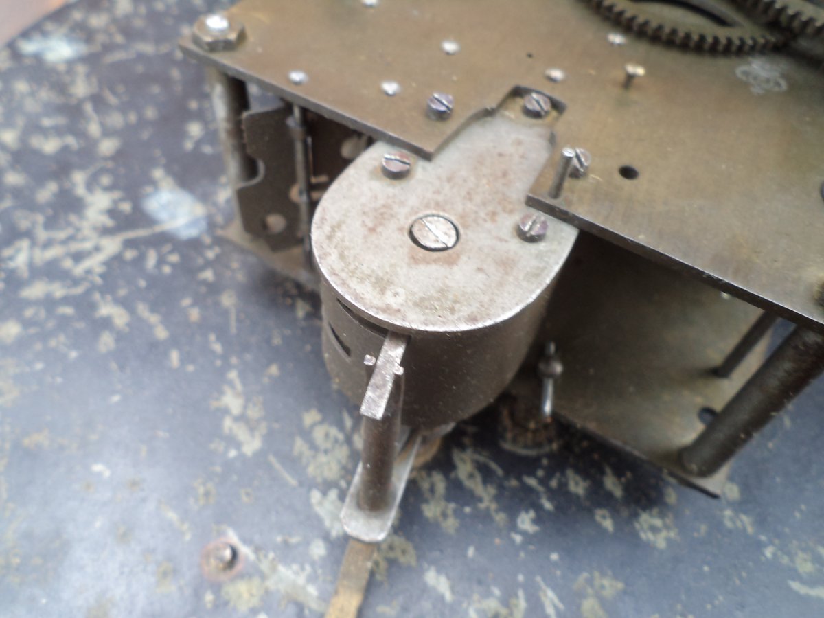 По характерній діагоналі можна сказати, що це масовий Шленкер-Кінзле. Взагалі потрібно фото задньої платини механізму - там є клеймо, хоча вже зрозуміло що це масовий і недорогий механізм. Потрібно попустити гвинти, один з ниих позначений жовтою стрілкою, аналогічний з протилежного, і витягнути мех. по червоній стрілці.