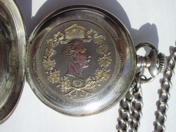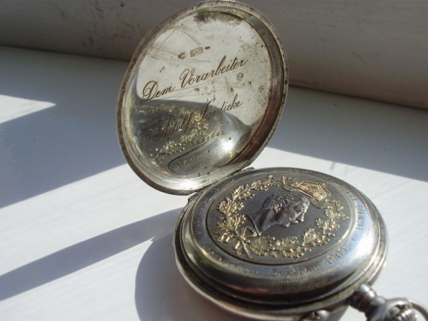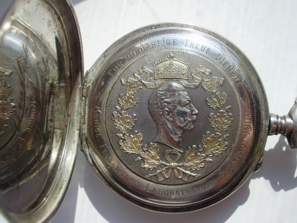 Вот что то нашол! Серебряный случае, позолоченные в местах Количество 1469945. Крышка несет имперской шифр "W", выгравированный внутри, "Dem Betriebsarbeiter Фридрих Hansen" (Для Машинист Фридрих Hansen). Вернуться крышку несет портрет Вильгельма II окруженный венком и увенчана короной и преданность надпись, "Меховой 30 Jährige Treue Dienst -. Königl Feuerwerks Laboratorium Шпандау 1909" (За 30 лет верной службы - Королевский взрывчатых веществ Лаборатория Шпандау 1909 ". эмалированный циферблат. Филигрань руки. надписью производителя." Густав Хайнрикс Frankfurt / M ". Dürrstein & Ко Дрездене. Cal. Колумба. 15 драгоценных камней. Компенсация колесо баланса с спираль Breguet и тонкой настройки.