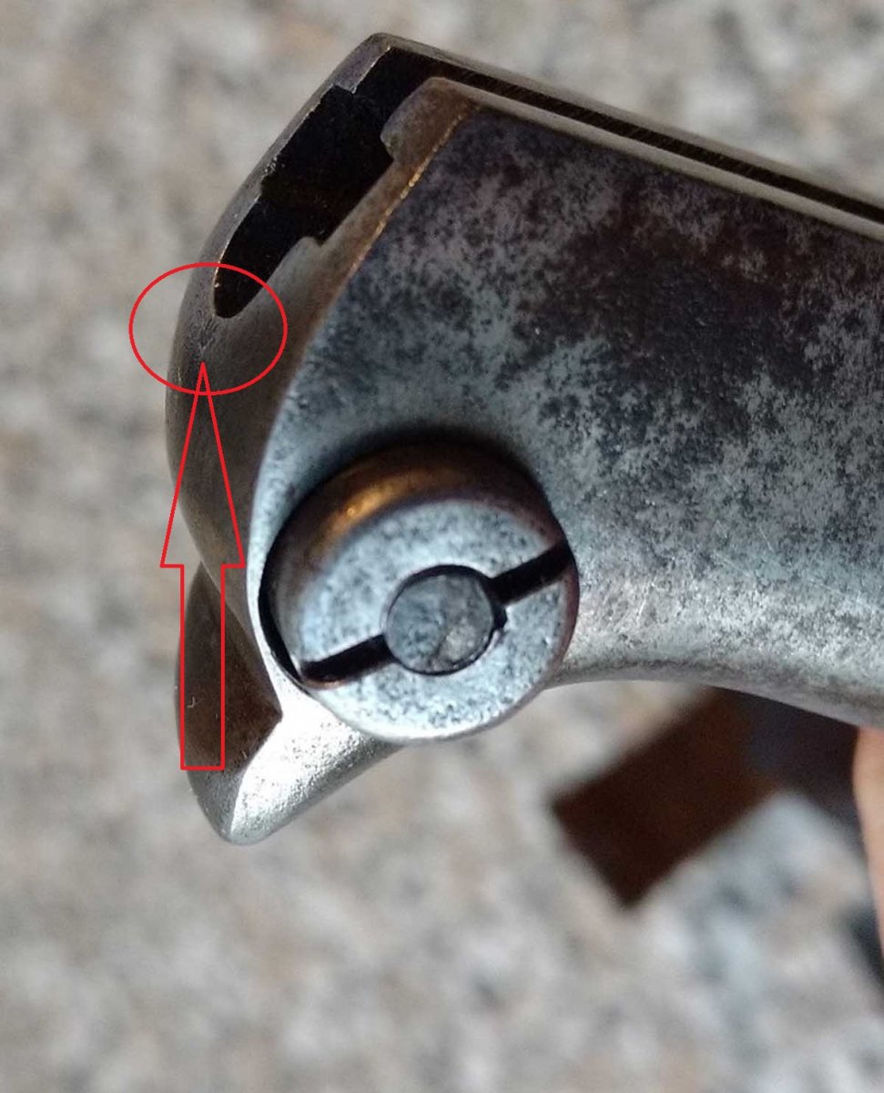 Чуть дополню свои измышления : не секрет, что у многих (не большинстве, но встречающихся периодически) пристяжных коммерческих "офицерах" присутствует шат, люфт клинка относительно рукояти (прямое следствие того, что клинок крепится под щёчками одной, не слишком надёжной заклёпкой), как и у внестоевых Ks98. Также, у пристяжных встречаютсяи разбитые (развёрнутые, раскрытые - условно, как рожковый гаечный ключ) пазы для прилива (фото даю). То же самое встречается и у внестроевых ("парадников") ks98. Понятно, что можно и у строевых штыков пазы развернуть ("сдуру, можно и куй сломать"), но про пристяжные и ножи и окопники - это есть неоспоримый и факт.Нерадивые продавцы борются с люфтом клинков забиванием швейной иглы в зазор или капанием туда же суперклея. Появился повод пристально осмотреть свои предметики. Это ещё один плюс к моей версии о сугубо пижонско-парадновыходном предназначении данных...назову их "аксессуаров", ибо, из вышесказанного я делаю вывод, что изготавливались они из более сырого материала. На пригодных эрзац-штыках ваффенмайстер ставил государственное клеймо приёмки, стало быть они соответствовали тогдашнему ГОСТу, а многочисленные "офицерские окопники" - нет. Вот и вся недолга.