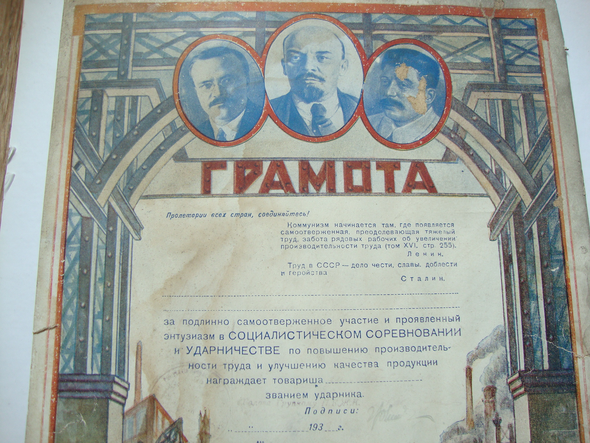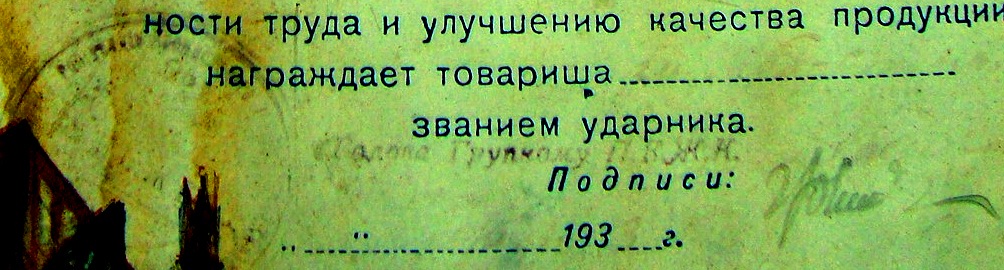 Вітаю! Враховуючи втрати, думаю, вартість Вашої грамоти від 100 грн.. Додам трохи... Так, Скрябін В'ячеслав Михайлович (Молотов) був головою Раднаркому з 19 грудня 1930 по 6 травня 1941 року. Думав спочатку теж, що грамота могла бути вручена лише у цей період. Погрався із кольором, контрастом тощо. Виявився лише рік, підпис та посада нагороджуючого - "Голова Групкому П.К.Ж.К." та "1933 р.": . Що означає аббревіатура П.К.Ж.К., на жаль, не підкажу. Шкода, що повністтю вицвіла назва організації та ім'я нагородженого.