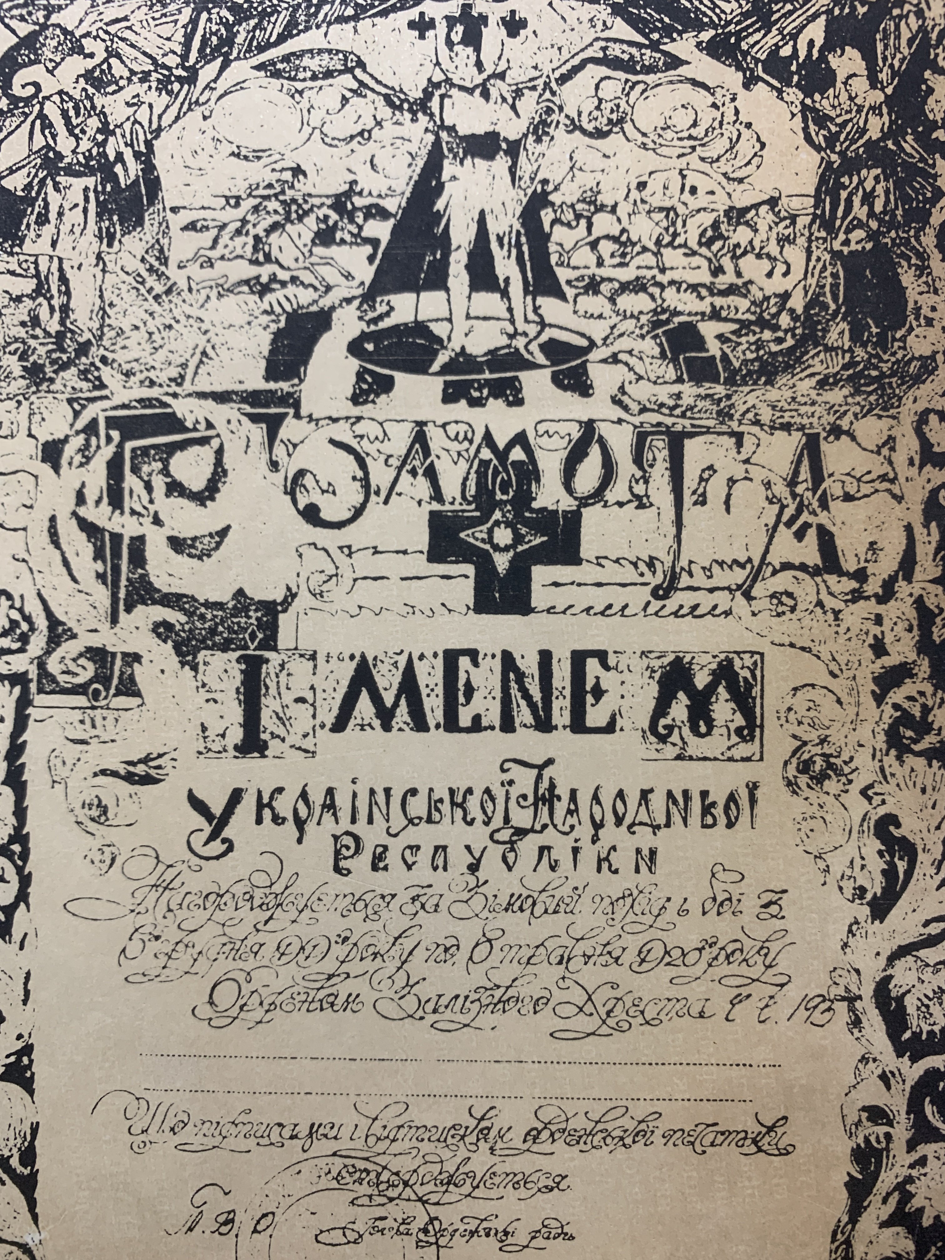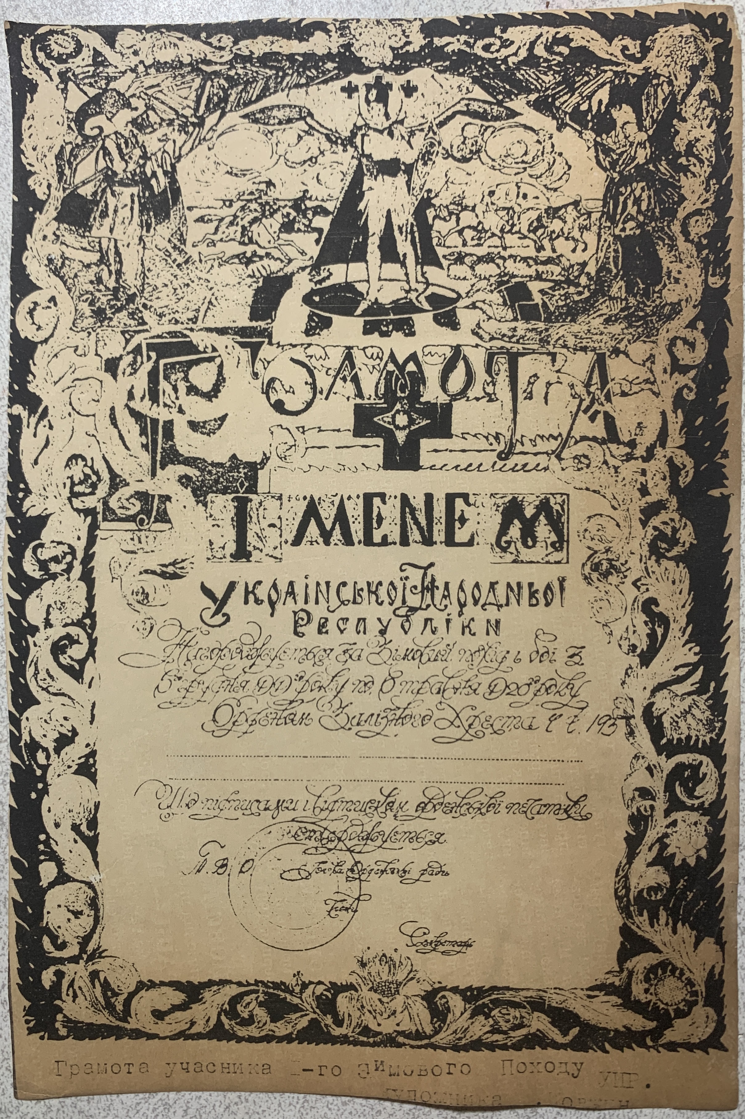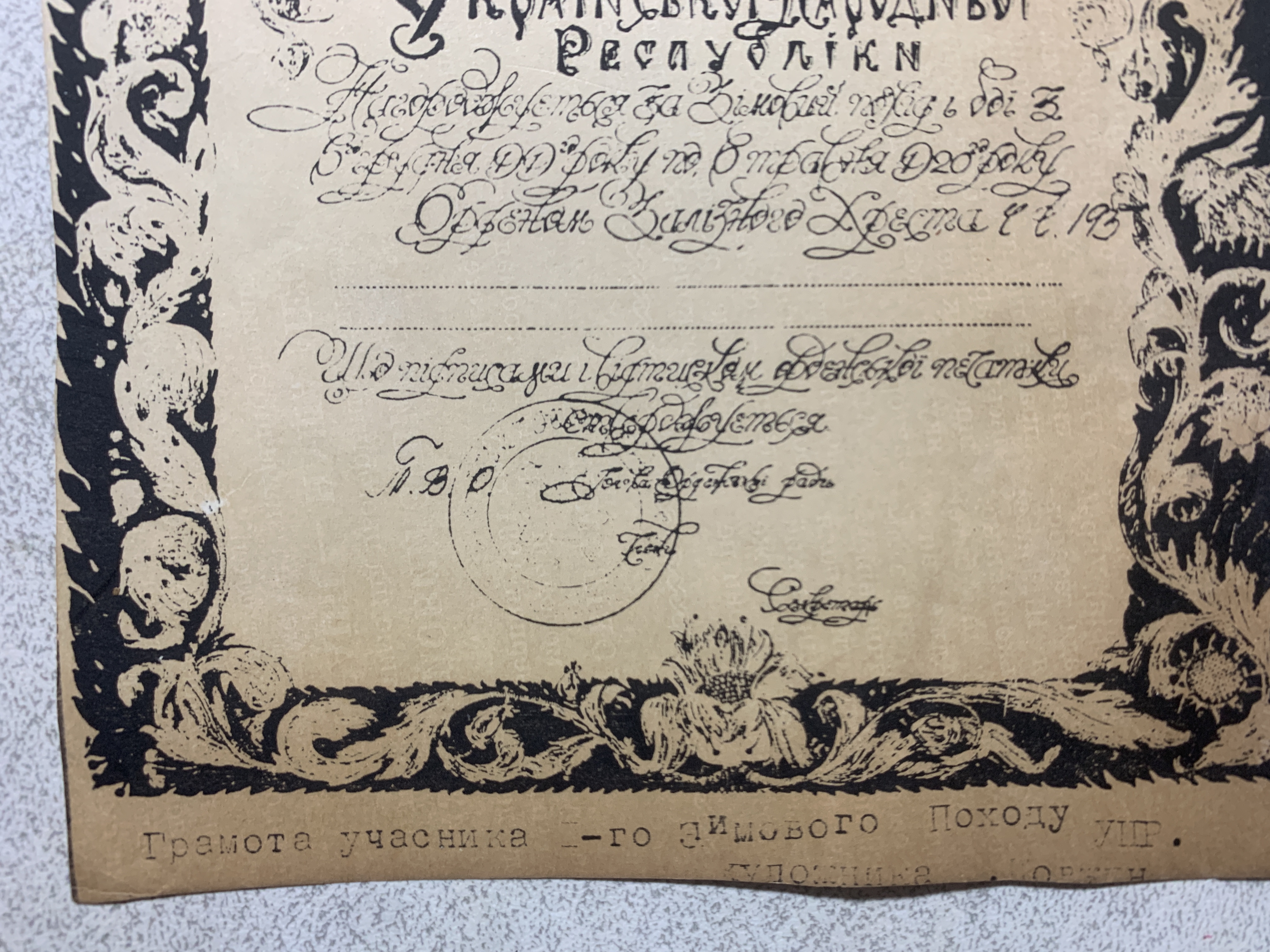Доброго! Припущу, що фотокопія із експозиції якогось музею, початок 90-х років. Автор https://uk.m.wikipedia.org/wiki/Ковжун_Павло_Максимович Грамота до жетону Залізного хреста "За Зимовий похід і бої" З повагою,