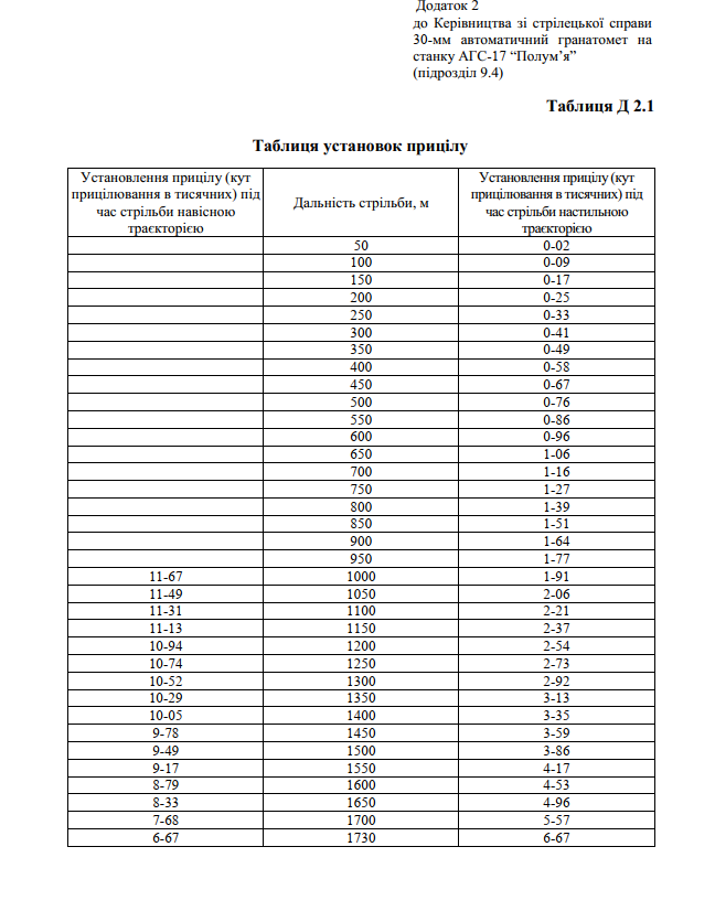Доброго дня!Кому доводилося працювати з гранатометом агс17, чи є таблиця стрільб з закритих ВП для даного гранатомету.