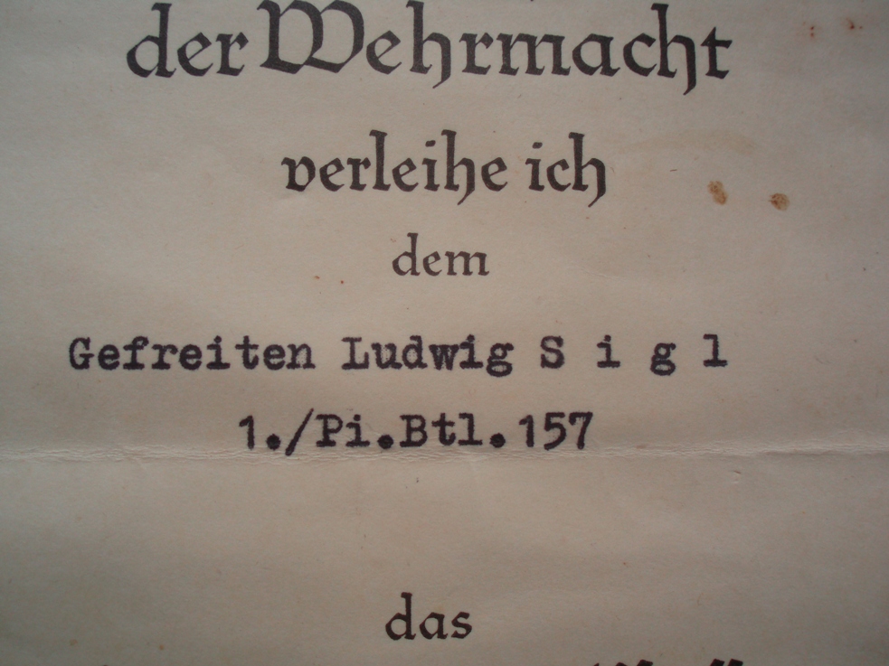 Приветствую Группа на ефрейтора Ludwig Sigl (погиб в 22 года под Воронежем,через 2 месца после награждения ЖК2) , воевавшего в составе 157 Pionier Bataillon ,57 пехотной дивизии (Умань ,Кривой рог,Харьков,Белгород ......) Наградной на ЖК 2 подписан генерал-лейтенантом Oskar Blümm (кавалер РК ,награжден в ноябре 1941г) http://en.wikipedia.org/wiki/Oskar_Blümm 250 евро