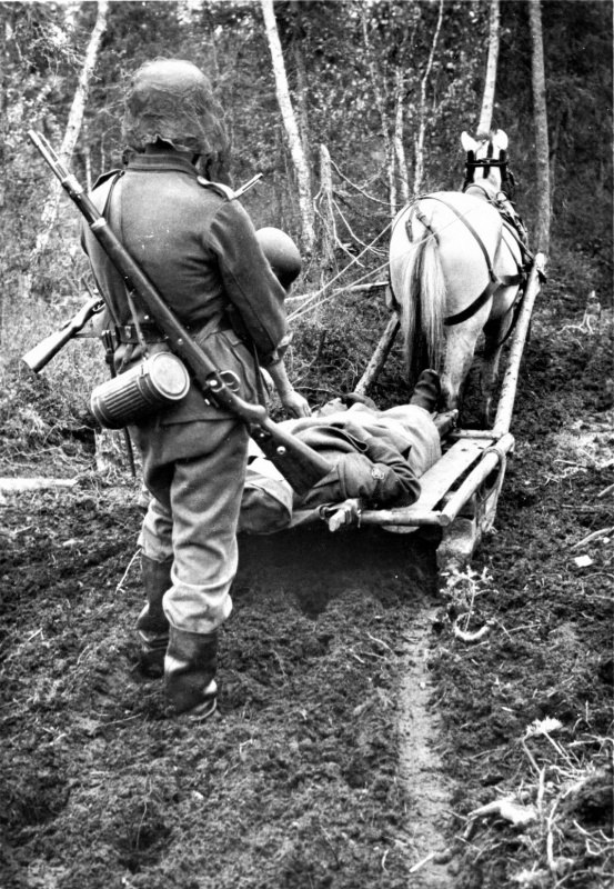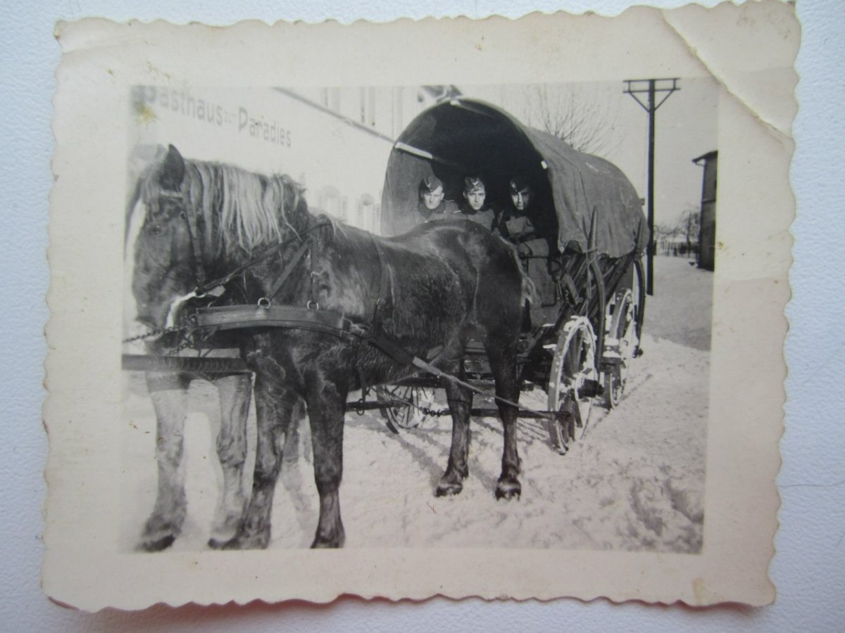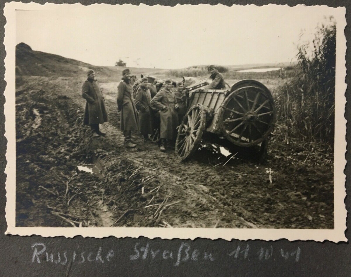 1) Bierfass im 1 achs Pferdeanhänger während der Schlammperiode im Osten 5.ID 2) Pferde Gefechtswagen im tiefen Schlamm am Panzer III Wrack an der Ostfront