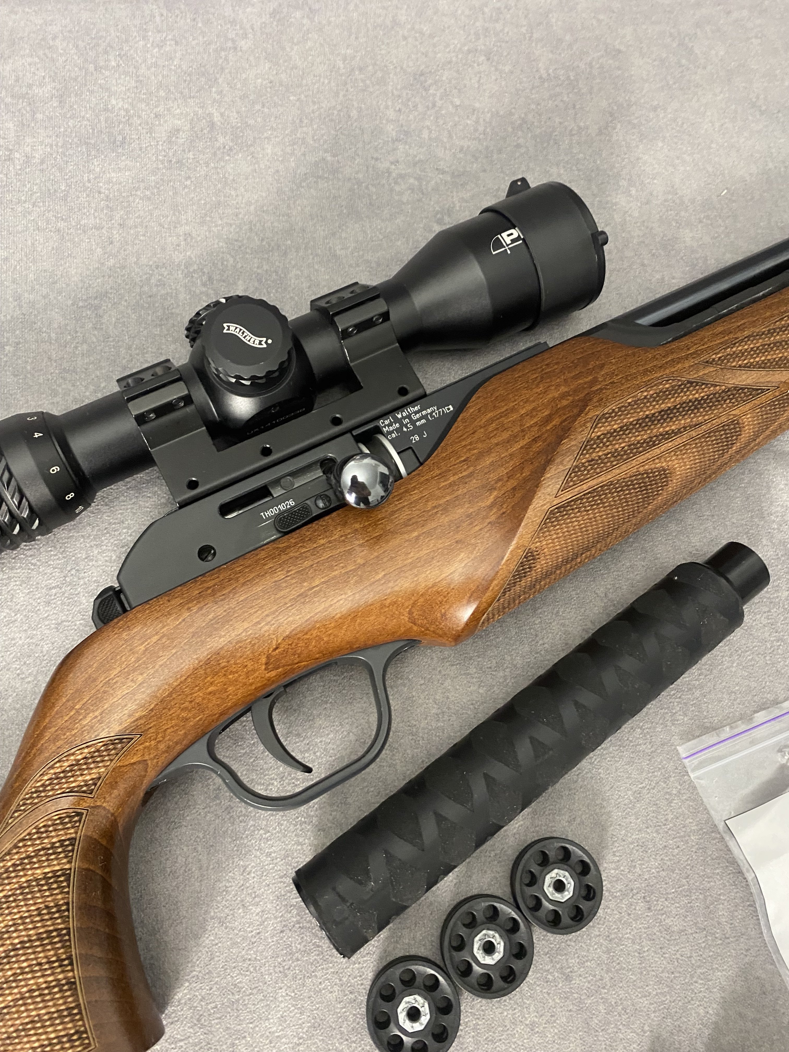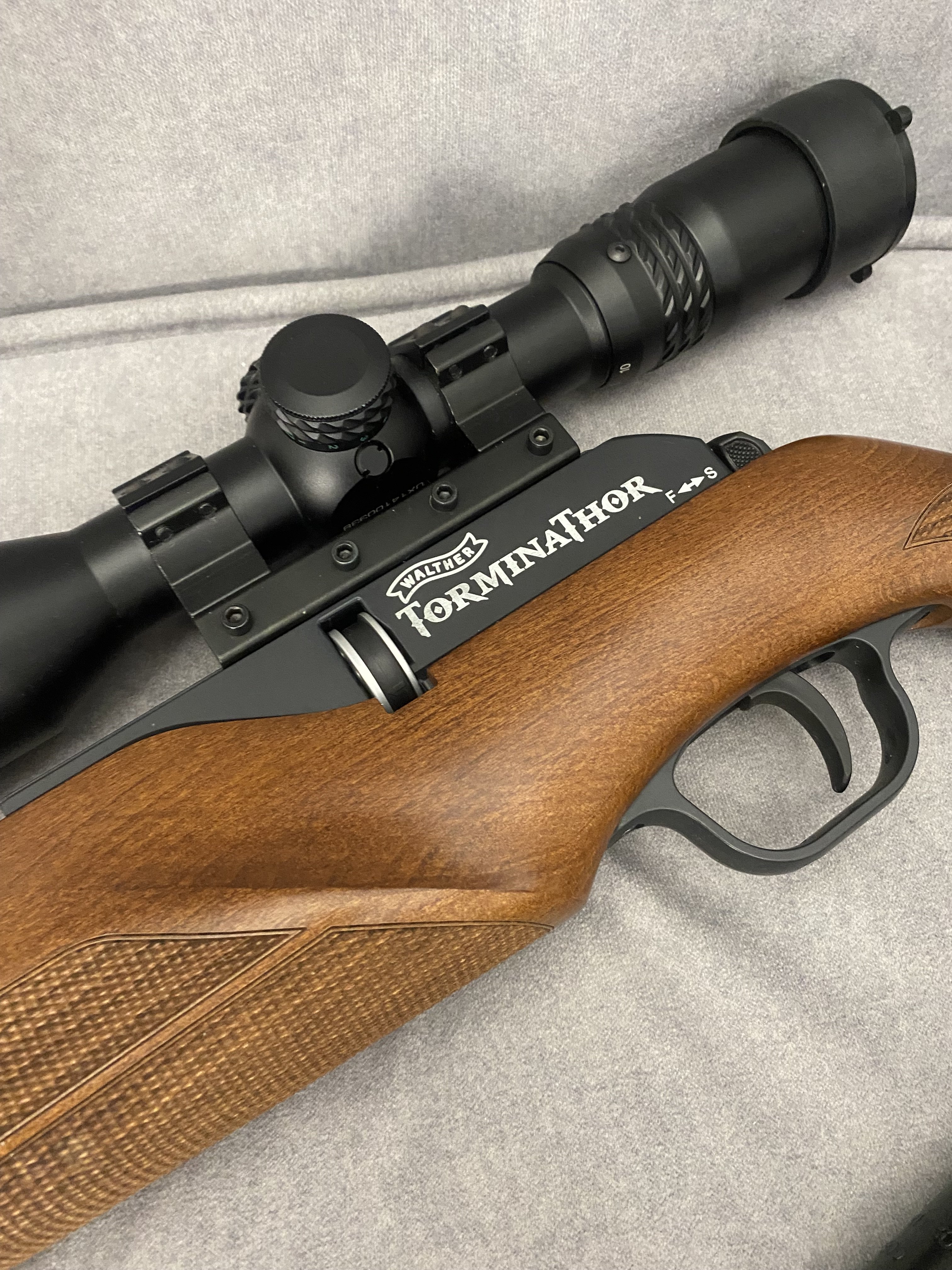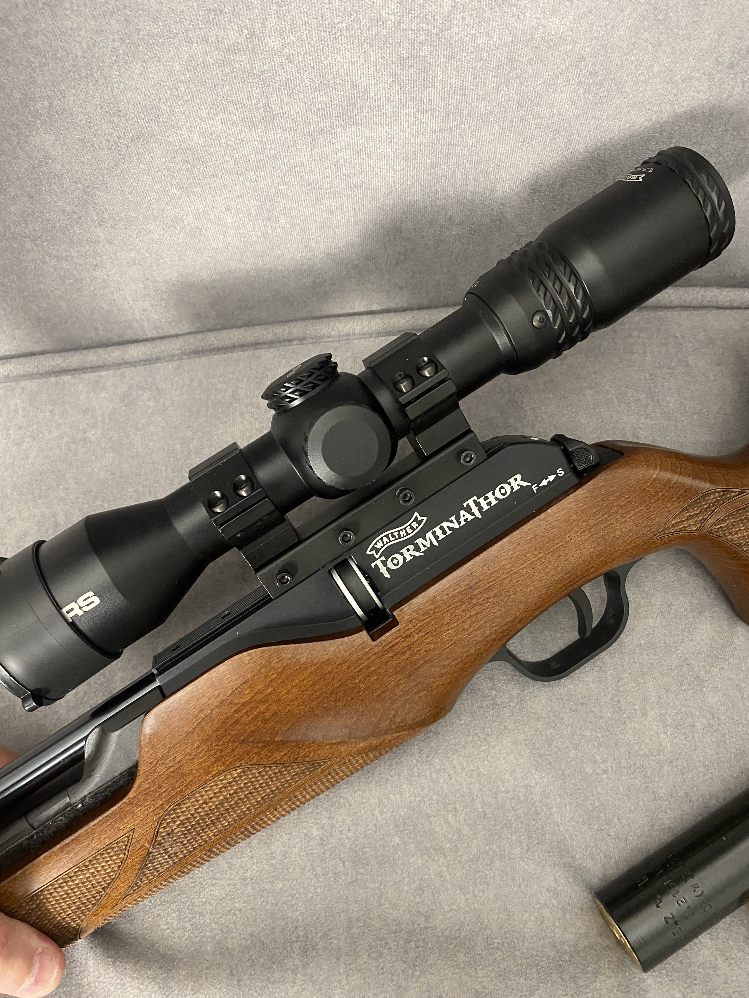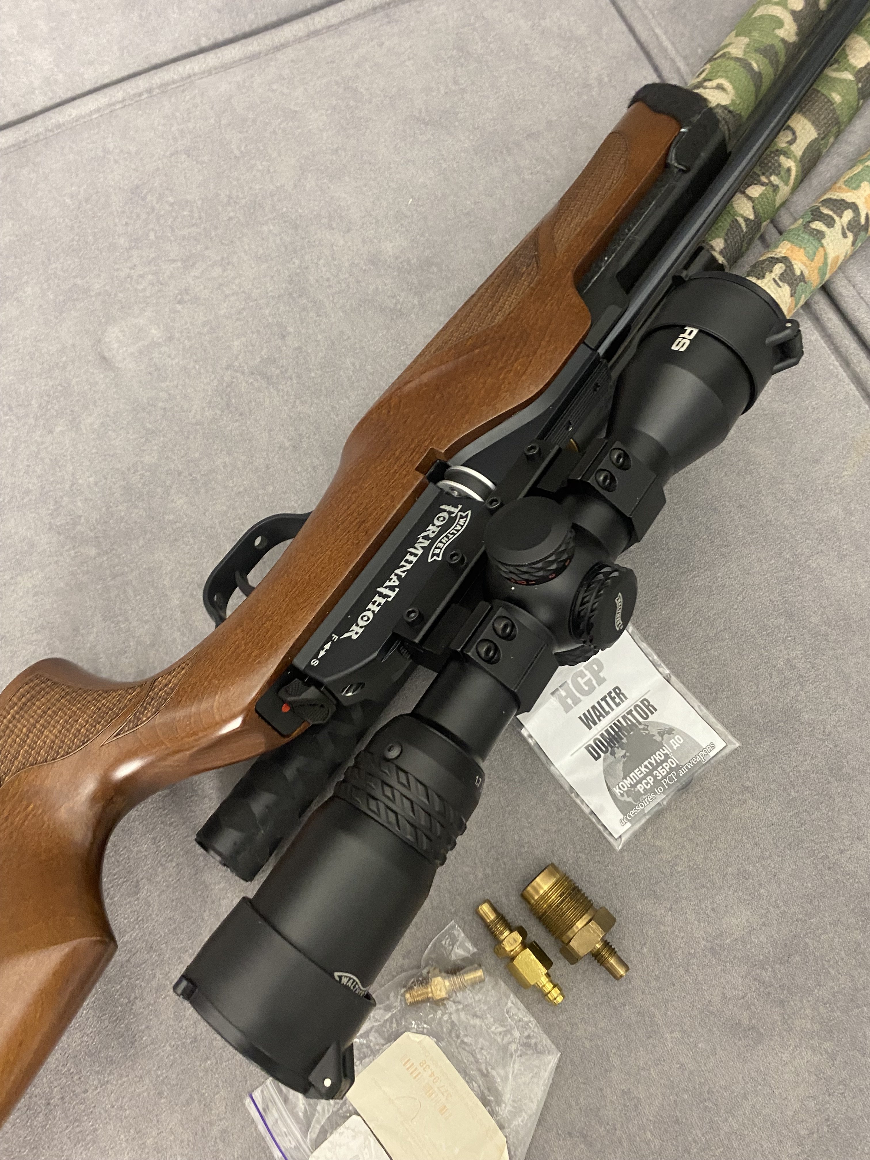 Продам PCP гвинтівку Walther Torminathor в дуже хорошому стані Чистий німець .Найкраща в лінійці не (Rotex і не Dominator)Має не автоматичний запобіжник, ствол ЛВ довжиною 600 мм.Магазин на 8 набоїв револьверного типу дуже швидко заряджається.Дуже гарне ложе горіхове ложе Minelli .Редуктор з заводу на 28 дж.Виглядає шикарно.Кучність кулями JSB Monster 0,87 г. Redesigned на 25 м. до 10 мм. Про комплект оптика Walther з підсвіткою зелена та червона 1,7*10*40 мм. На 50 метрів вистачає .В комплекті рідний резервуар та записний бу той що запасний трохи травить коли знятий коли стоїть на гвинтівці ні .Два глушники один Raptor silent X другий напів інтегрований від Пневмокайфу .4 магазини 1 алюмінієвий рідний + 3 оригінальних пластикових нових .Три заправні штуцери яких зараз не знайти.Ремкомплект .+ кулі .Насос новий 4 рівневий .Гвинтівка рідкісна і дуже класна.Ціна 40000,00 Оплата на карту .