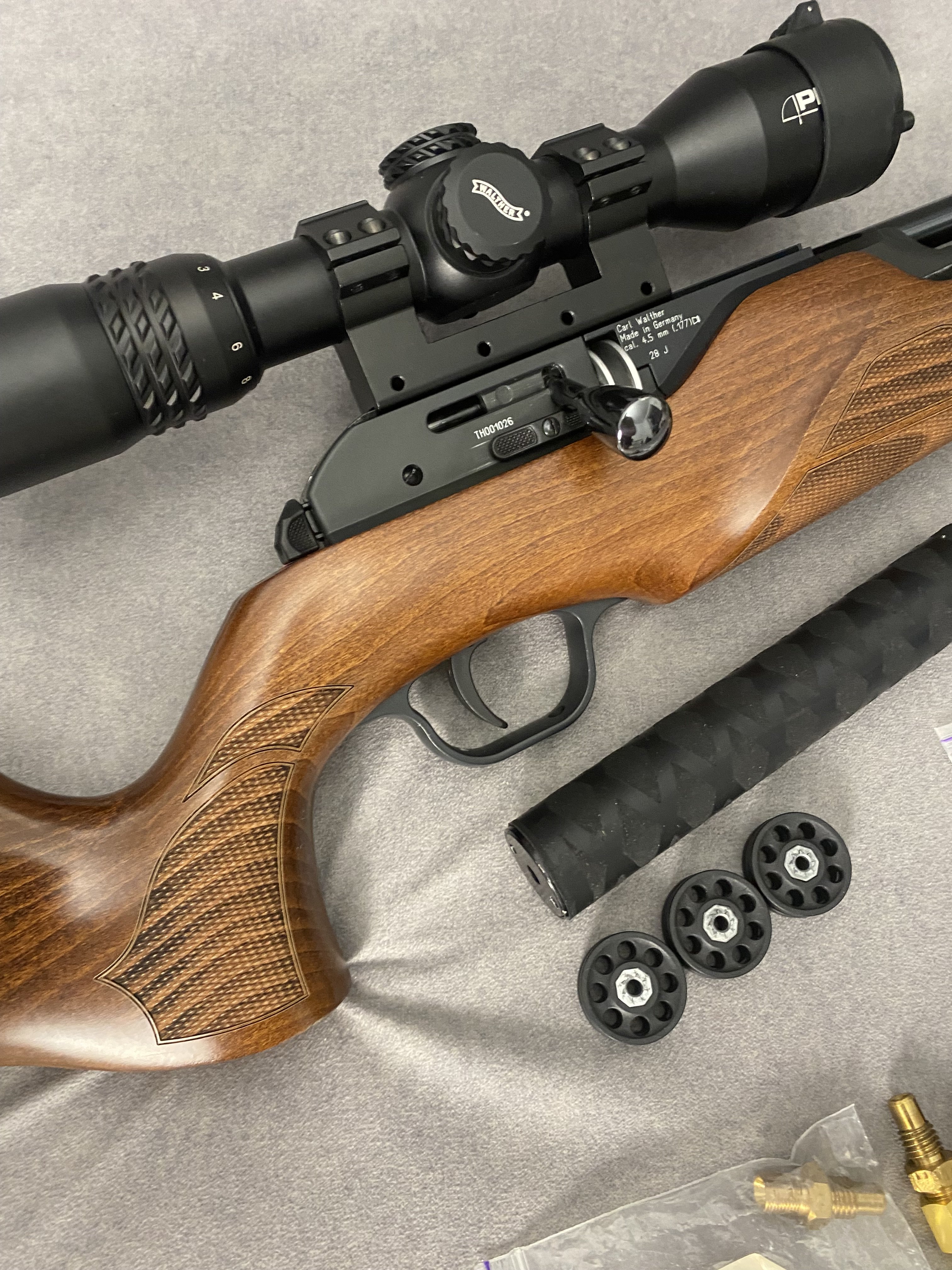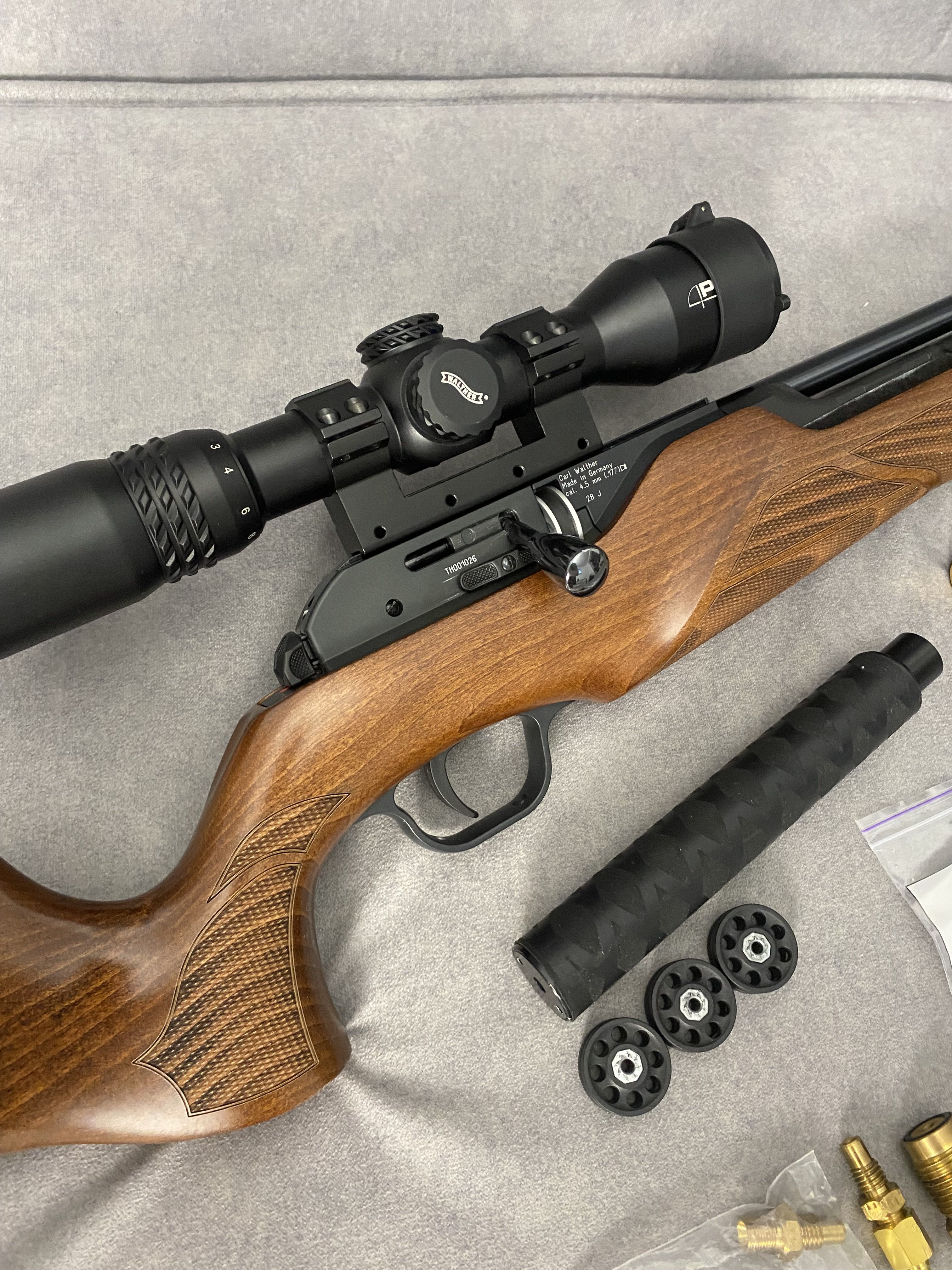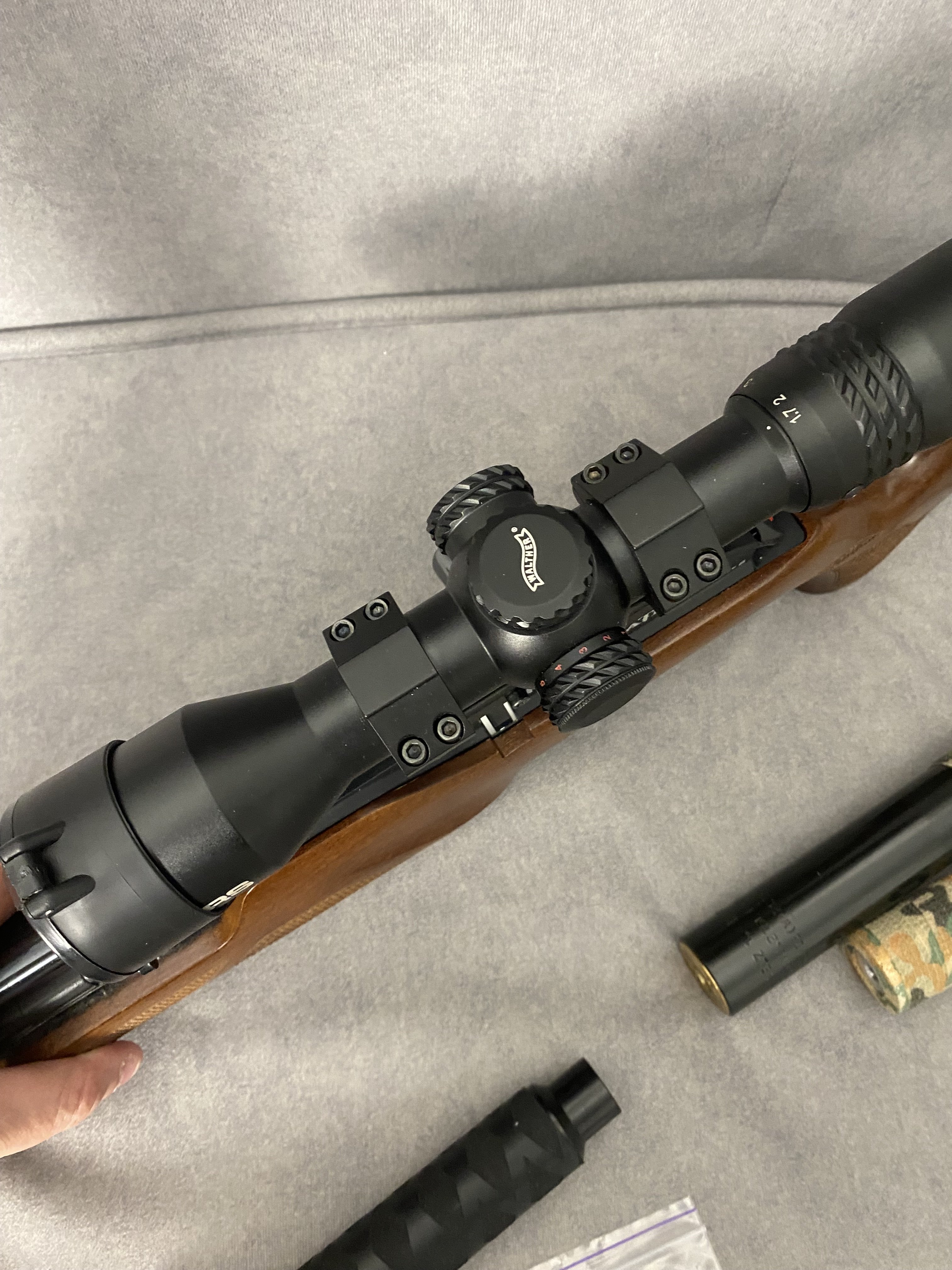 Продам PCP гвинтівку Walther Torminathor в дуже хорошому стані Чистий німець .Найкраща в лінійці не (Rotex і не Dominator)Має не автоматичний запобіжник, ствол ЛВ довжиною 600 мм.Магазин на 8 набоїв револьверного типу дуже швидко заряджається.Дуже гарне ложе горіхове ложе Minelli .Редуктор з заводу на 28 дж.Виглядає шикарно.Кучність кулями JSB Monster 0,87 г. Redesigned на 25 м. до 10 мм. Про комплект оптика Walther з підсвіткою зелена та червона 1,7*10*40 мм. На 50 метрів вистачає .В комплекті рідний резервуар та записний бу той що запасний трохи травить коли знятий коли стоїть на гвинтівці ні .Два глушники один Raptor silent X другий напів інтегрований від Пневмокайфу .4 магазини 1 алюмінієвий рідний + 3 оригінальних пластикових нових .Три заправні штуцери яких зараз не знайти.Ремкомплект .+ кулі .Насос новий 4 рівневий .Гвинтівка рідкісна і дуже класна.Ціна 40000,00 Оплата на карту .
