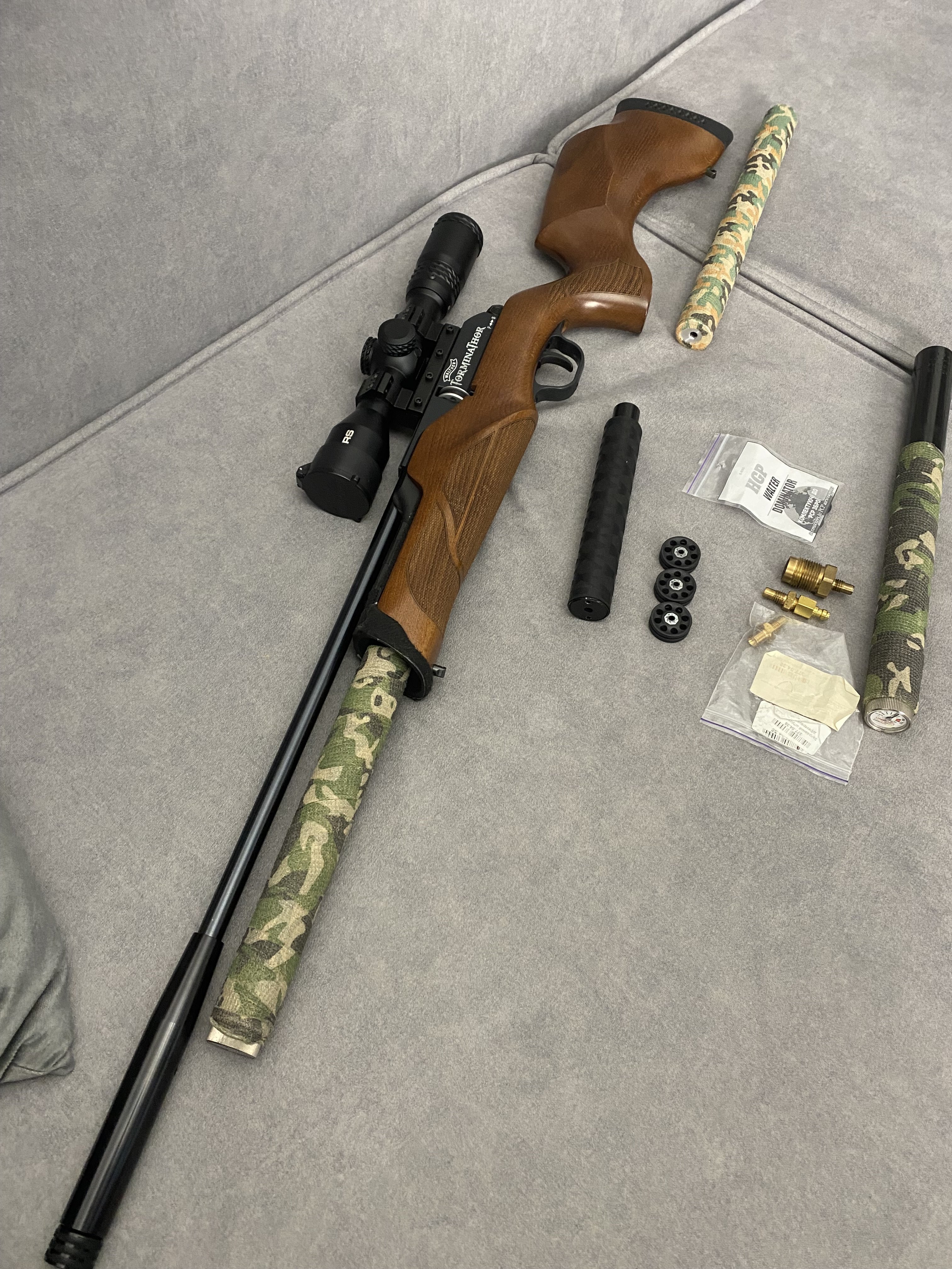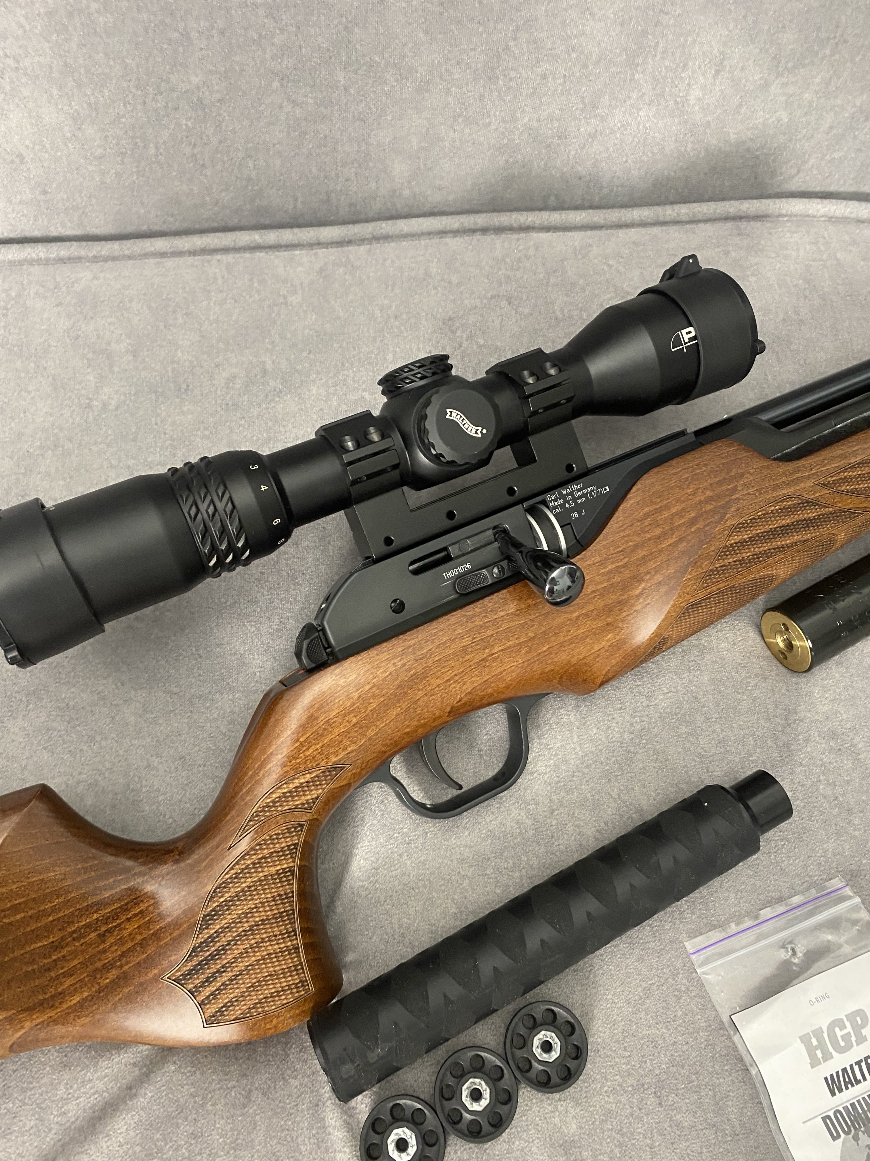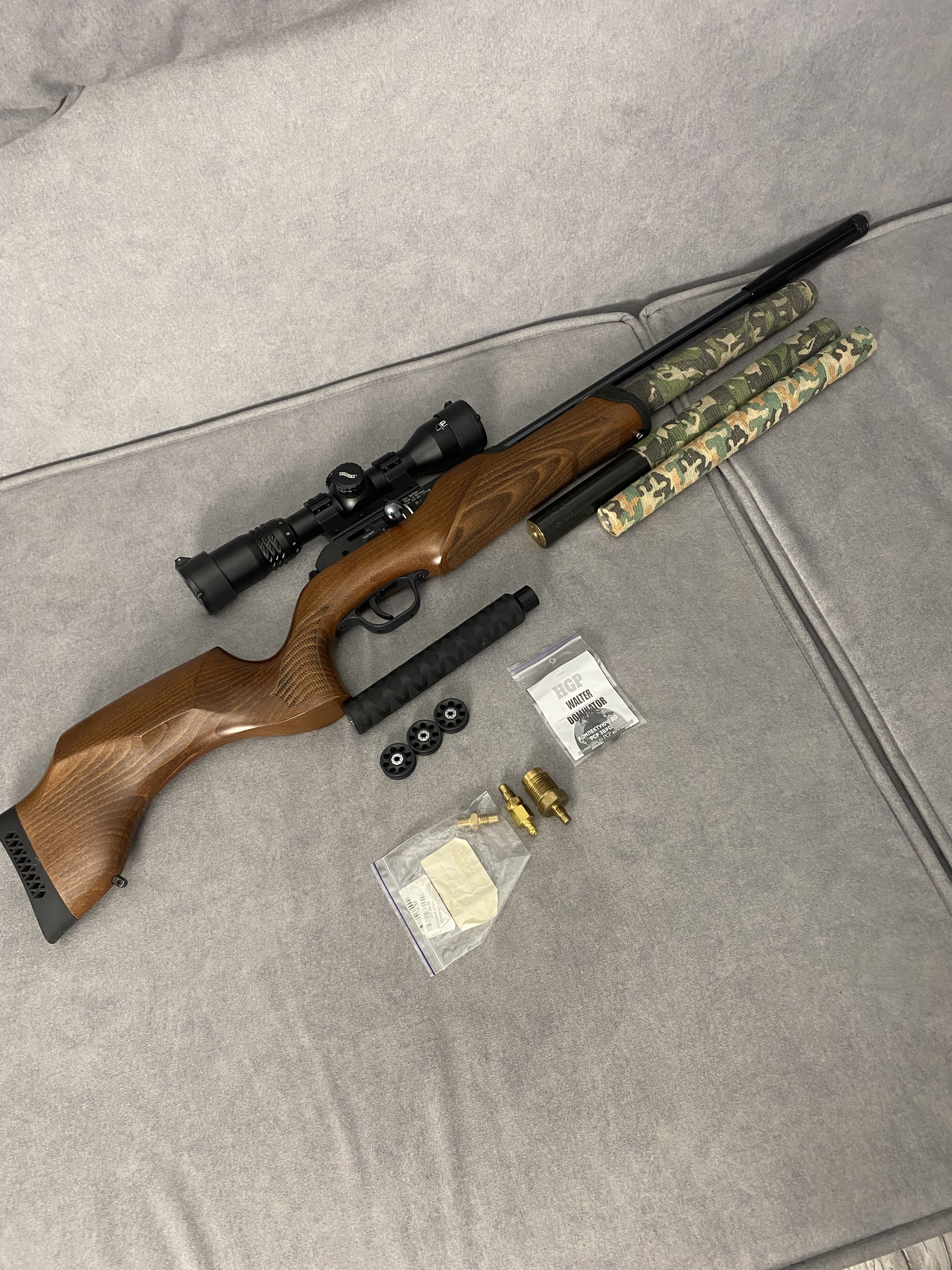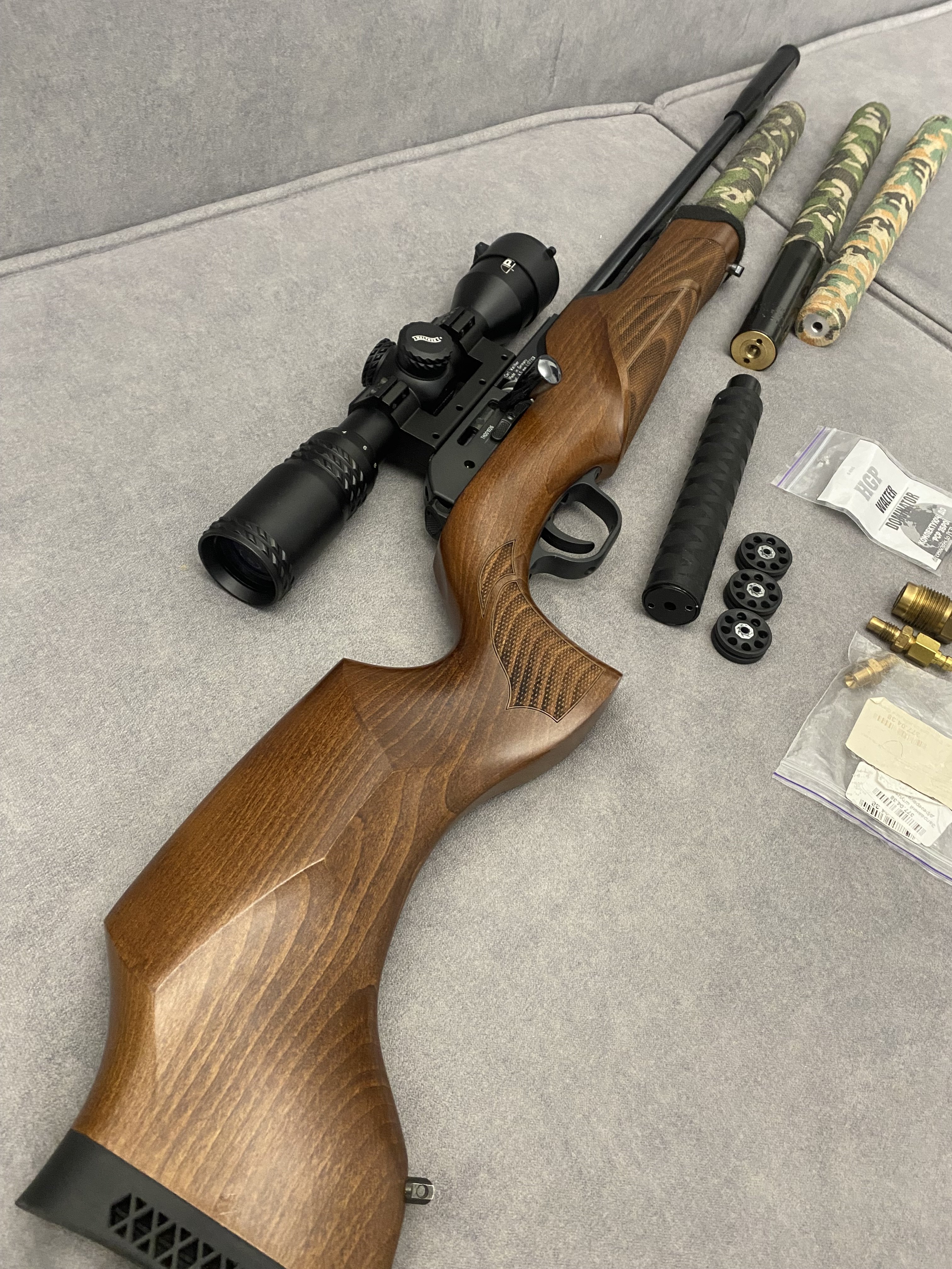 Продам PCP гвинтівку Walther Torminathor в дуже хорошому стані Чистий німець .Найкраща в лінійці не (Rotex і не Dominator)Має не автоматичний запобіжник, ствол ЛВ довжиною 600 мм.Магазин на 8 набоїв револьверного типу дуже швидко заряджається.Дуже гарне ложе горіхове ложе Minelli .Редуктор з заводу на 28 дж.Виглядає шикарно.Кучність кулями JSB Monster 0,87 г. Redesigned на 25 м. до 10 мм. Про комплект оптика Walther з підсвіткою зелена та червона 1,7*10*40 мм. На 50 метрів вистачає .В комплекті рідний резервуар та записний бу той що запасний трохи травить коли знятий коли стоїть на гвинтівці ні .Два глушники один Raptor silent X другий напів інтегрований від Пневмокайфу .4 магазини 1 алюмінієвий рідний + 3 оригінальних пластикових нових .Три заправні штуцери яких зараз не знайти.Ремкомплект .+ кулі .Насос новий 4 рівневий .Гвинтівка рідкісна і дуже класна.Ціна 40000,00 Оплата на карту .