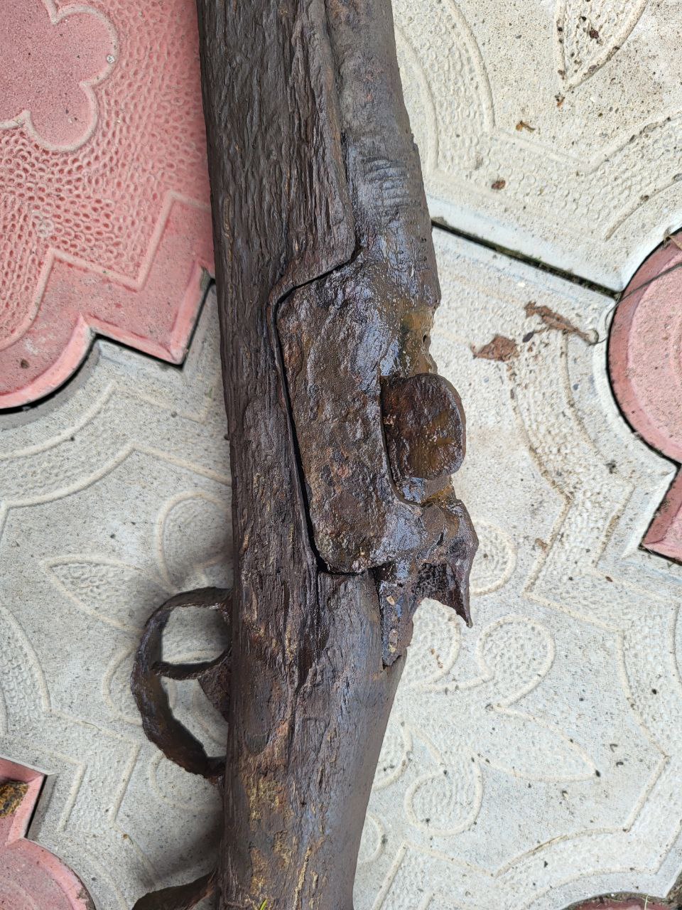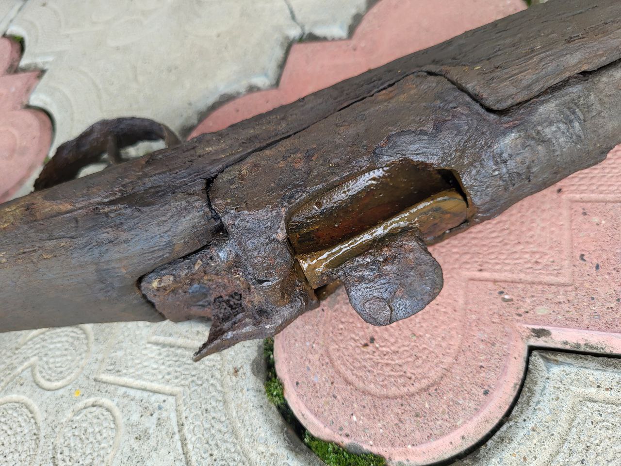 Интересный предмет, но судя по состоянию, нашли вы его в воде и без консервации через пару тройку недель вы его просто выкините-дерево после высыхания начнет рассыпаться, а метал отслаиваться. Рекомендовал бы после отфотографирования положить его в ванну с водой, что бы купивший мог из этого что то сделать По цене-я думаю реальность может показать только аук-реставраторов таких вещей у нас не много, но вещь прикольная
