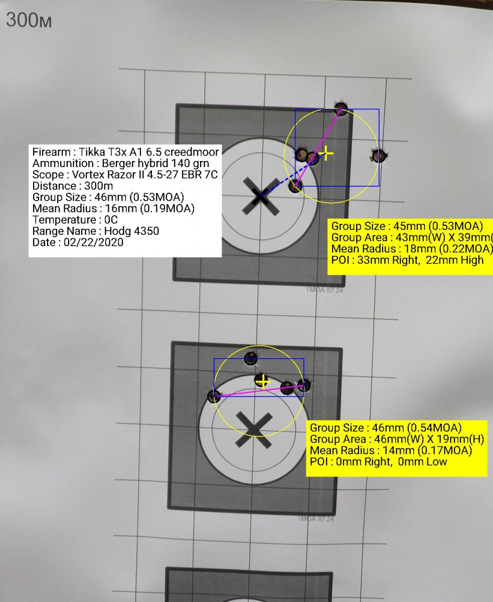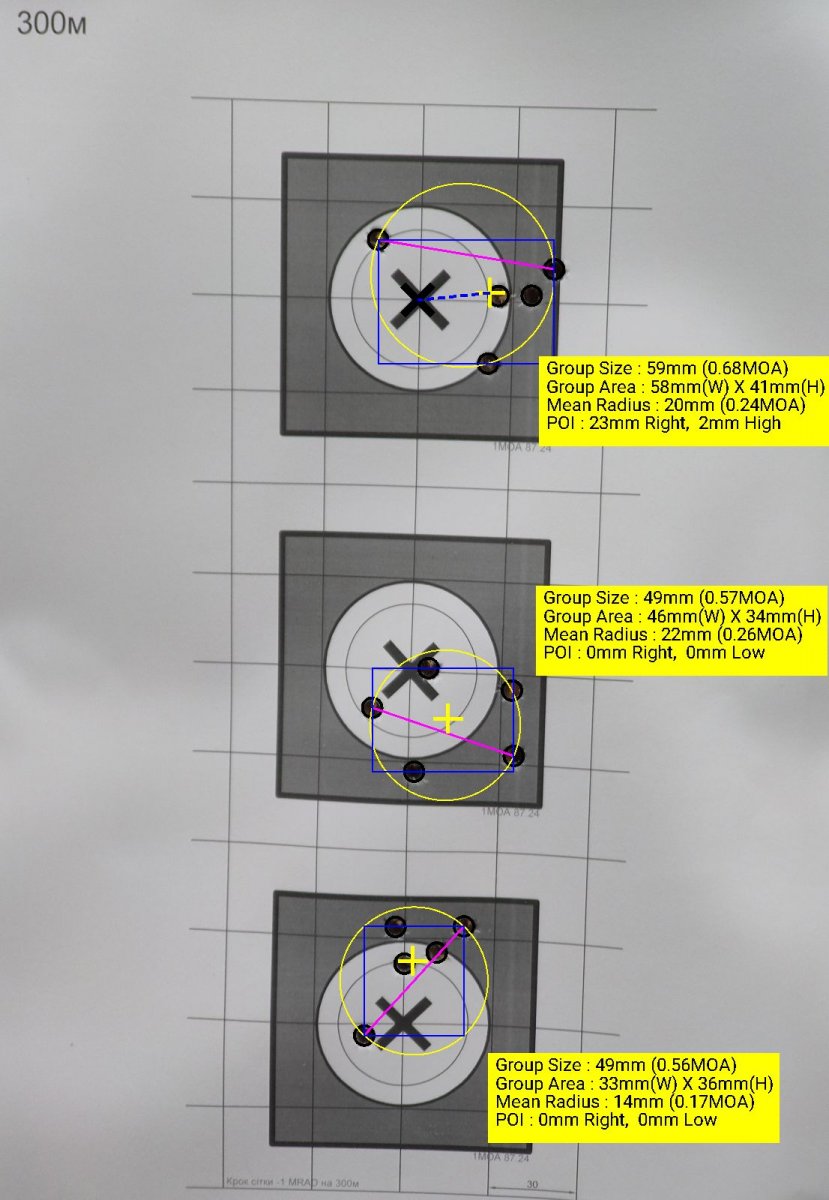 Доброго дня, шановні форумчани. Придбав в майстра прибор ІНТЕГРАЛ з кульовим каналом титан для 6.5 Creedmoor і набір для .308 (різьбовий блок + набір конусів). 6.5 для високоточки а .308 для полювання. В суботу мав можливість протестити прибор на Tikka T3x TACTICAL A1 кал.6.5 Creedmoor. Мої перші враження та результати. На дистанції 100 та 300 метрів групи вийшли не більше 0,5 МОА(це без підбору набоїв і за не дуже сприятливих умов). СТП змістилася відносно робочого ДТК -15 мм на сьому годину на дистанції 100 м (мішень 1). Звук комфортний. Віддачу знімає трохи гірше за ДТК і це зрозуміло, оскільки основна задача модератора звук. Протестив прибор в перегрітому стані, зробивши безперервну серію 2х5 - прибор тримає СТП стабільно і група збирається теж стабільно. Прибор виконано на високому рівні. Повне взаєморозуміння з майстром стосовно моїх побажань. Рекомендую!!! Кілька фоток.