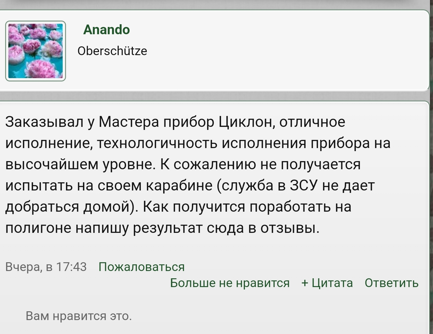 Вітаю всіх! Велика подяка Н майстру за т14 циклон... просто бомба! Це вже третій прибор в нас, 7.62 плюкає на рівні злого 22лр☺ Респект майстру!