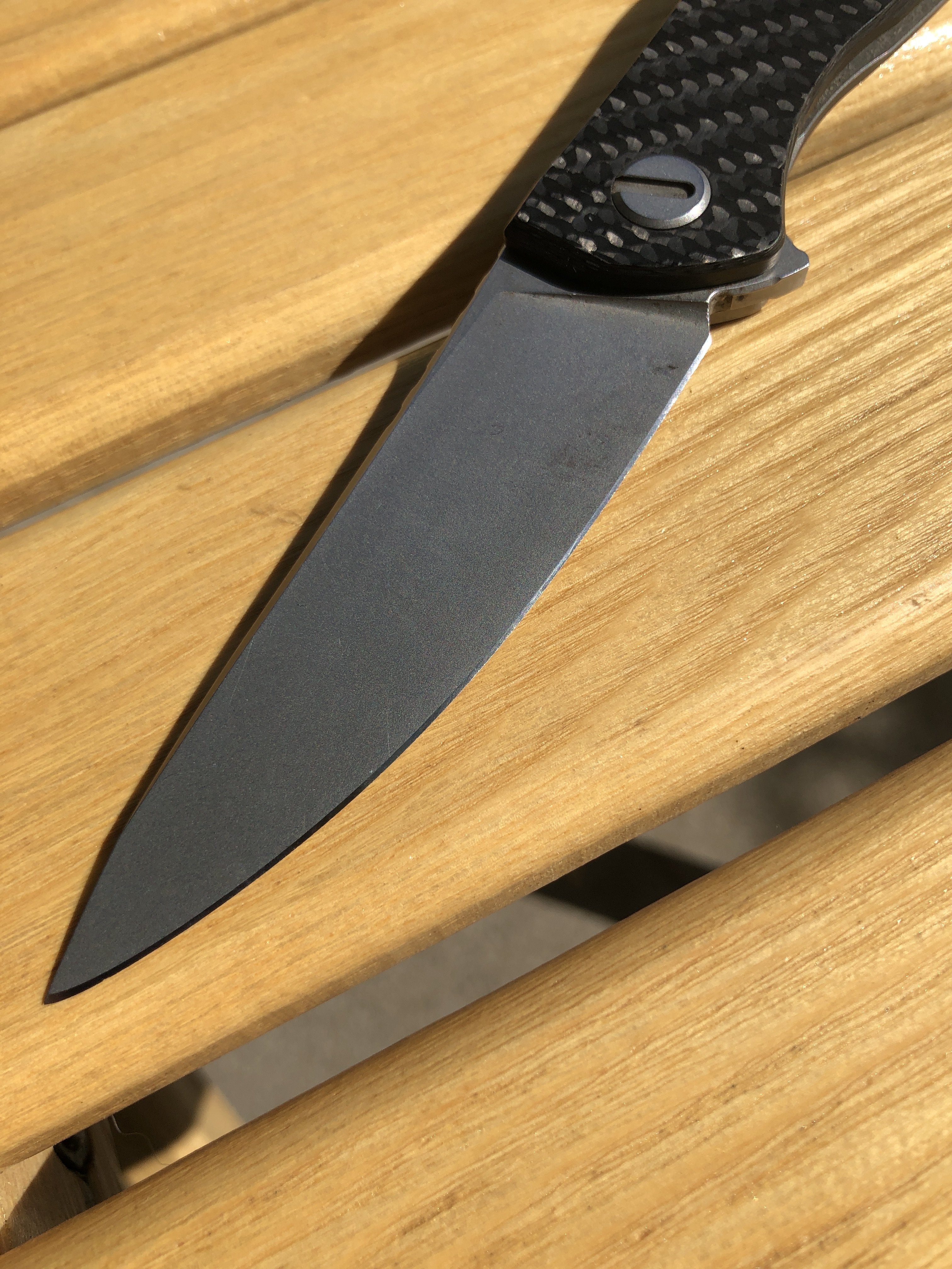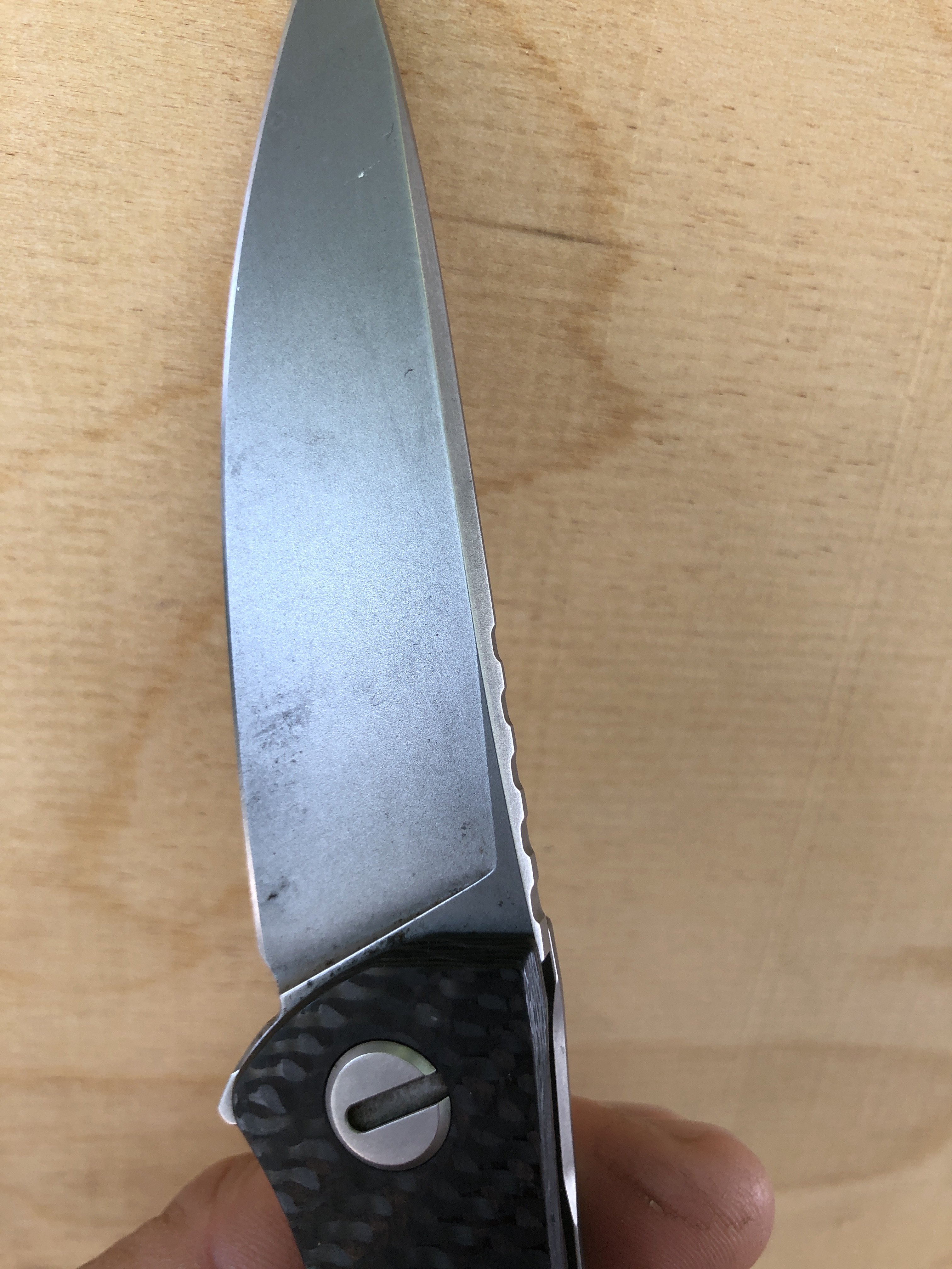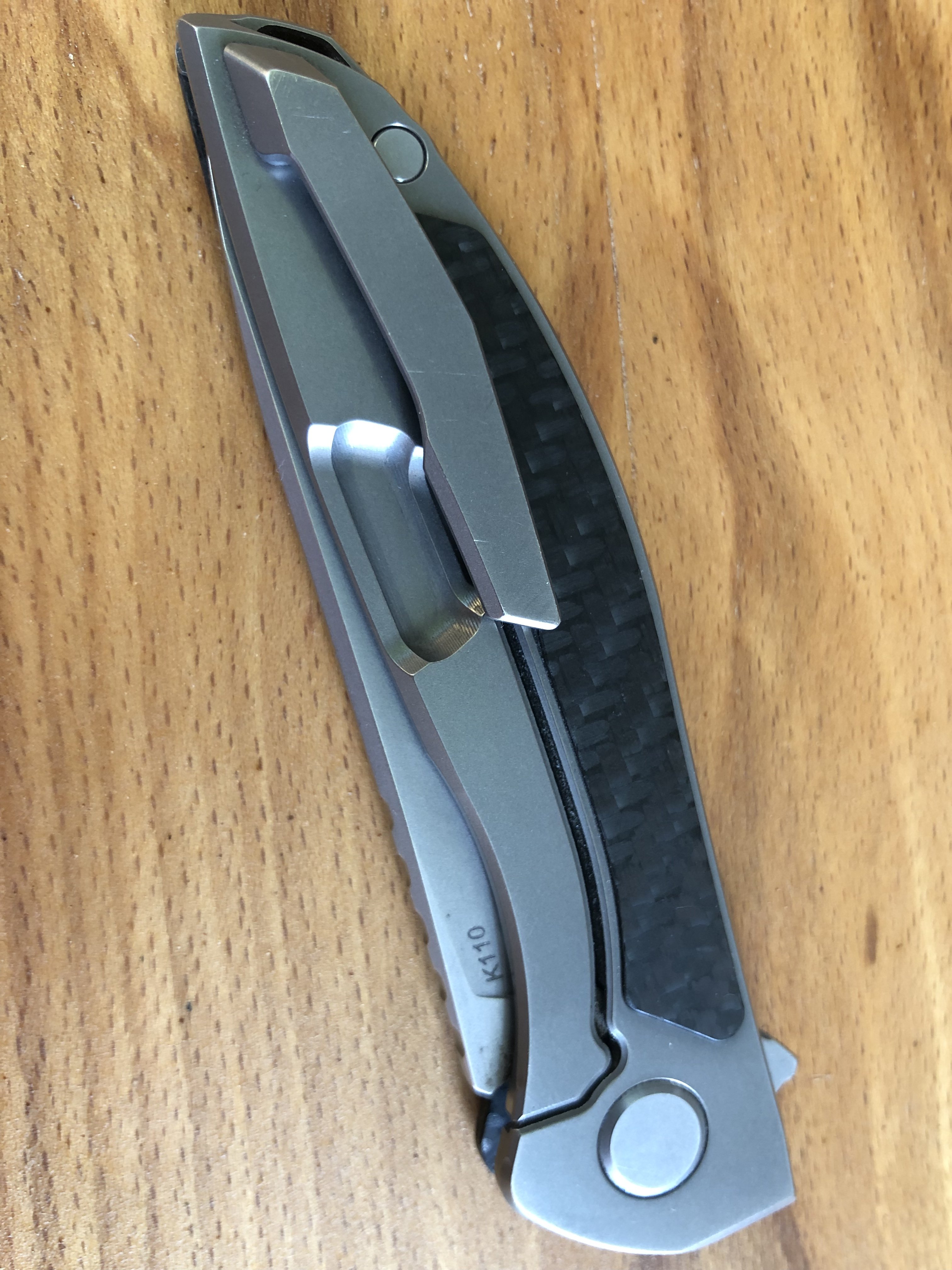 Вітаю! власне все в назві.приємний середнього розміру аксесуар на кожен день.до того ж з класних матеріалів.Був у використанні.Точився.Мені дістався вже таким.Від себе скажу- досить непогана термічка, механіка теж. загальна: 195 мм клин: 85 мм зведення 0.3 мм руків'я: 110 мм обух: 3 мм Ширина: 24 мм керамічний підшипник вага 75г Матеріал леза: Böhler K110 руків'я: титан, карбон виробник : Kanedeiia Китай ціна 2000грн