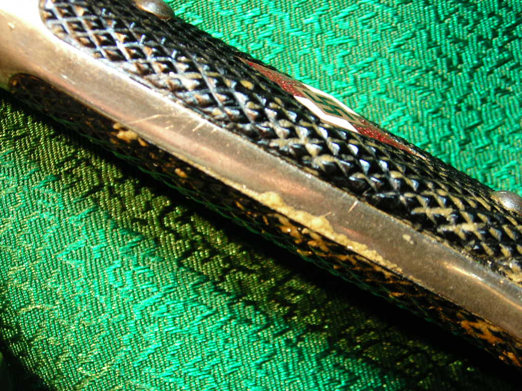 После всех ответов терзали сомнения оставлять нож или нет.Помог случай.Нож упас со стола и ромб выскачил.На чём он там держался не понятно,так как следов клея не видно.Клейма РЦМ тоже не было,но то что старый-однозначно.Поехал к продавцу,получил обратно 50 евро и извинения.Через три квартала ,в другом магазине купил ромб(подлинность,я думаю сомнений не вызывает М 1/120)Помучился ,но вставил.Получилось по моему неплохо.С таким ромбом 190 нормально или дорого?