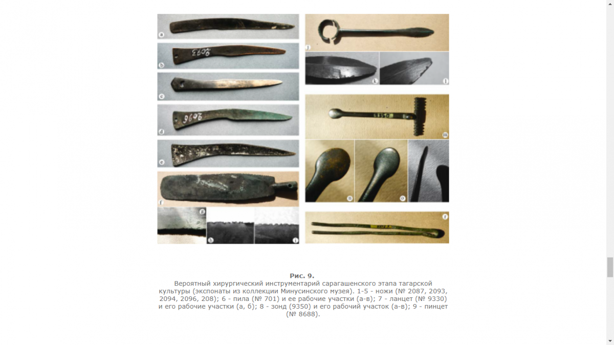Атрибуция таких предметов не всегда верная даже в "научных трудах". Есть даже мнение, что это медицинский инструмент мог быть таких размеров и формы. Кстати по картинке от Назара размер с изделием из поста верхнего не совпадает - 20 и 40 см разница существенная, поэтому связи там нет никакой. Никогда не задумывались, почему на аукционах такие вещи чаще подписывают, как "жертвенный нож" и почему их количество превышает те самые серпы к примеру? Просто серп и жертвенный нож будет иметь разную цену, вот и всё, что влияет на атрибуцию обычно. Ритуальные/жертвенные ножи украшались - семантика звериного стиля на таких изделиях присутствует в обязательном порядке. Тут я не вижу рисунков и фигур. Конечно "ножи" использовались по разным направлениям - ими и жали и зверушку могли резать. Но, изделие ятаганного типа - это просто серп. И повторюсь - всё что связано с ритуалами несёт на себе семантику образов. И размер таких изделий в районе 40 см. На Вашем изделии такого не наблюдается. Вот, для примера и эмпирического познания - фото из "книжки умной" с вариантом - медицинский инструмент.