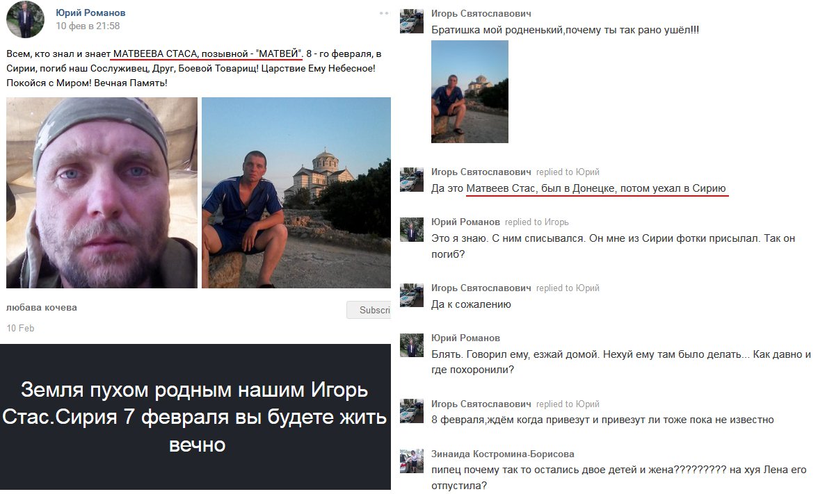 Матвеев Станислав по кличке "Матвей" (Асбест) воевал на Донбассе, убит в Дейр-эз-Зоре, Сирия.