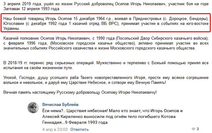 Осипов Игорь (Москва, 15/12/64) воевал в Приднестровье, Югославии, принимал участие в событиях на Донбассе, умер 03/04/19 в РФ от болезни