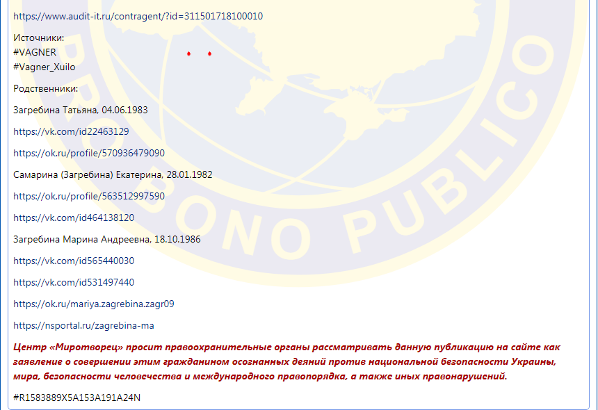 Загребин Владимир Анатольевич,"Спас", ЧВК Вагнера, прапорщик спецназа ГРУ в запасе, личный номер м-0367. Место жительства – Московская область. Родился 22/04/1972, воевал на Донбассе, стал Груз-200 в Сирии до 26.04.2017».