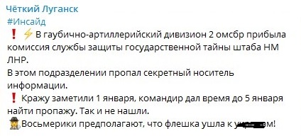 «В гаубично-артиллерийский дивизион 2 омсбр прибыла комиссия службы защиты государственной тайны штаба НМ ЛНР. В этом подразделении пропал секретный носитель информации. Кражу заметили 1 января, командир дал время до 5 января найти пропажу. Так и не нашли. Восьмерики предполагают, что флешка ушла к у… м!».