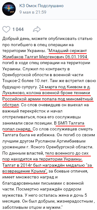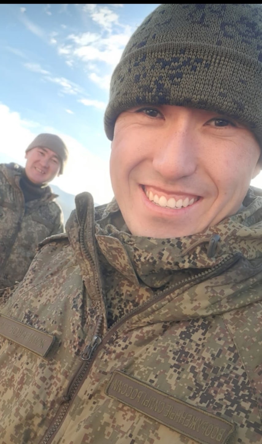 Жизнерадостный муж и отец мл.сержант Талгат Мергенович Жумбаков, 1994 г.р., в 2014 году получил медаль за "возвращение Крыма", а сам домой возвращаться не желает, несмотря на то, что 24/03/22 в Киевской обл. в его БМП попал снаряд ..