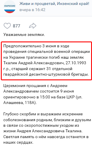 Старший сержант #31одшбр Андрей Александрович Ткалин, 1993 г.р. из города Инза Ульяновской области скоропостижно ушёл в Украине хз, когда, ну, пусть будет 03.06.22. Та похер когда он подох, главное что подох!