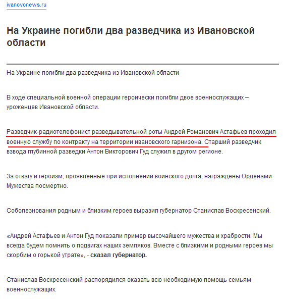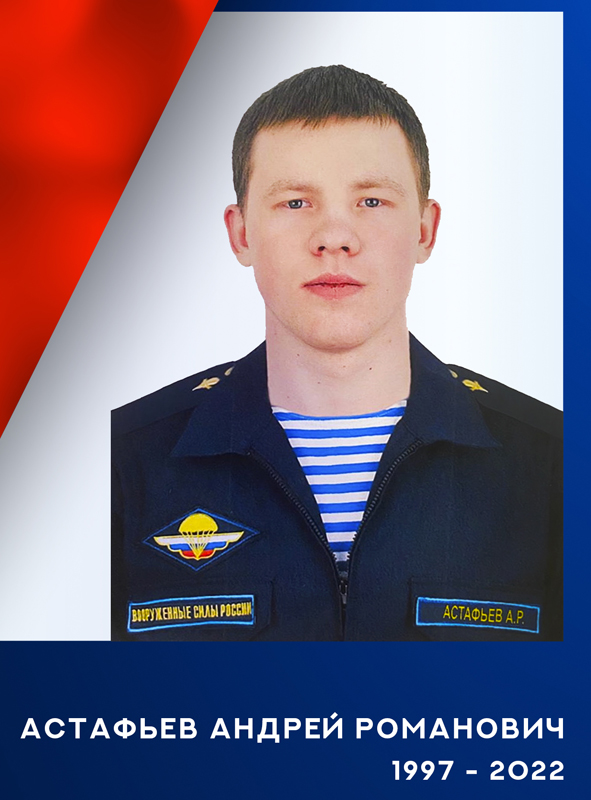 Разведчик-радиотелефонистка разведывательной роты Андрей Романович Астафьев, 1997 г.р., проходил военную службу по контракту на территории ивановского гарнизона, показал пример храбрости и сдох почему-то в ходе СВОВУ.