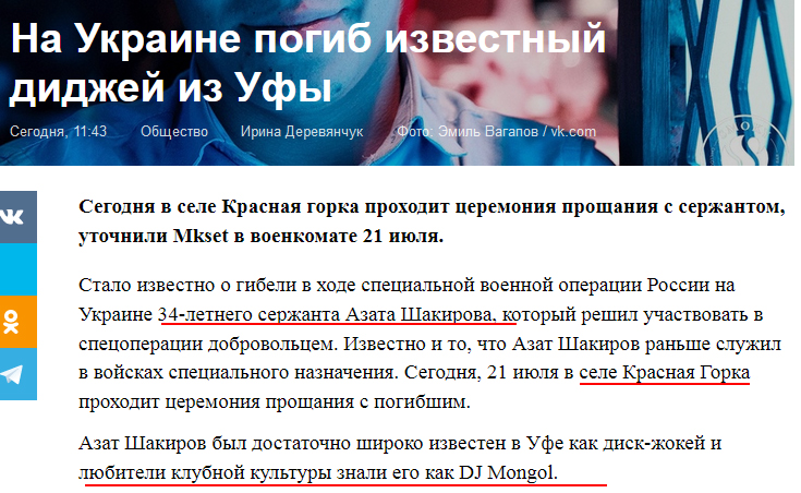 34-летний бывший спиртназовец, сержант Азат Шакиров из башкирского села Красная Горка, кому-то известный как DJ Mongol, решил подзаработать в Украине. Ну и всё, заработал как раз на 2 метра земли над своим гробиком.