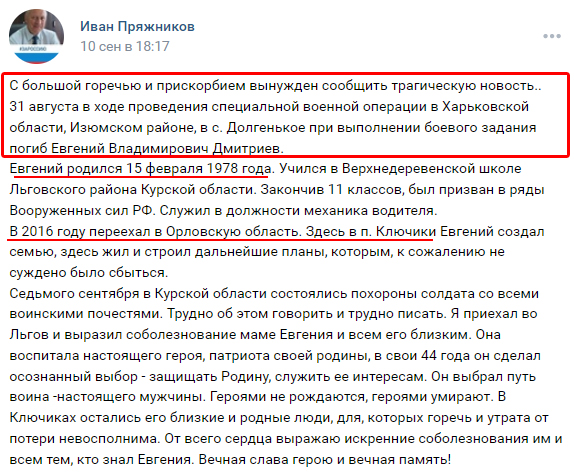 Уже не житель посёлка Ключики Орловской обл., Евгений Владимирович Дмитриев, 1978 г.р. в свои 44 года патриотично решил подзаработать в Украине и тупо сдох в последний день лета в селе Долгенькое Харьковской обл.