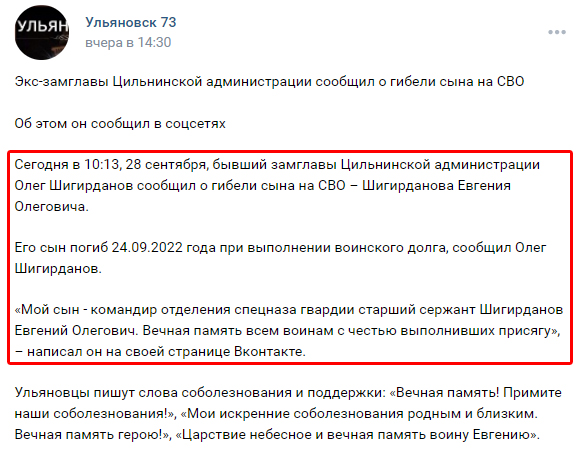 Сын бывшего замглавы администрации Цильнинского района Ульяновской области командир отделения спецназа старший сержант Евгений Олегович Шигирданов, 24/09/22 демилитаризовался в Украине. Сильно задолжал потому что ...