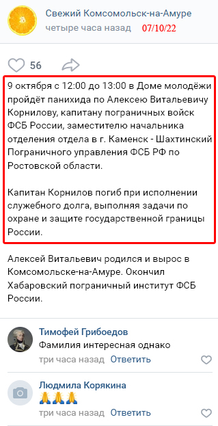 Уроженец Комсомольска-на-Амуре, выпускник ФГКОУ ХПИ ФСБ, зам. нач. отделения отдела в Каменск-Шахтинском ПУ ФСБ РФ по Ростовской обл. капитан погранвойск ФСБ Алексей Витальевич Корнилов так удачно защитил госграницу, что внезапно скончался... На корниловских фронтах!