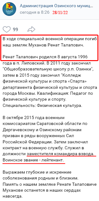 Физически культурный педагог, заместитель командира взвода лейтенант Муханов Ренат Талапович, 1996 г.р., из Саратовской обл. демилитаризовался в ходе СВОВУ, но не переживайте, мы его быстро забудем. Да уже забыли!