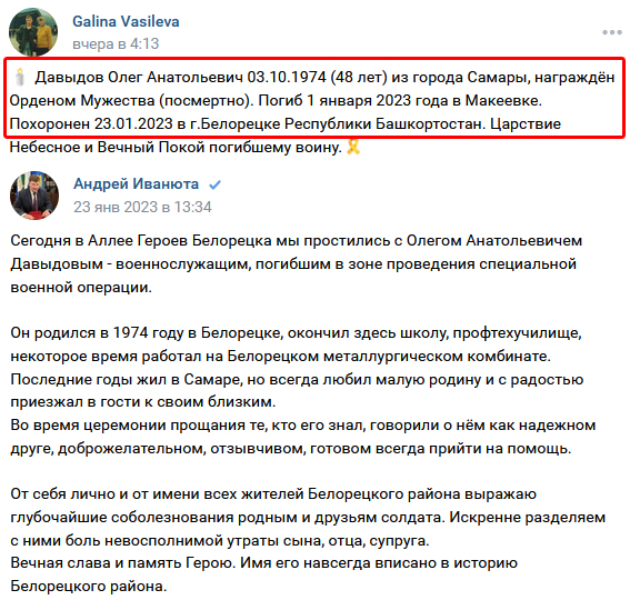 роженец башкирского Белорецка, Давыдов Олег Анатольевич 1978 г.р. в последние годы жил в Самаре, на новый 2023 год съездил в Макеевку и вернулся обратно по месту рождения. Завершил жизненный цикл, так сказать... как лосось!