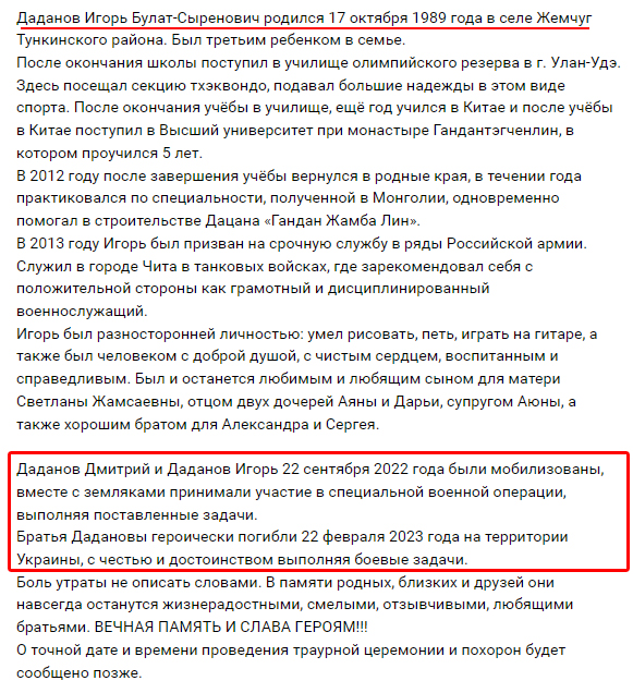 Два брата-дегенерата Дадановы, Дмитрий Булатович 1984 г.р. и Игорь Булат-Сыренович 1989 г.р. вместе чмобилизовались 22/09/02 и дебурятизовались ровно через 5 месяцев под Угледаром. Такая вот брато-бурято-убийственная война получилась.