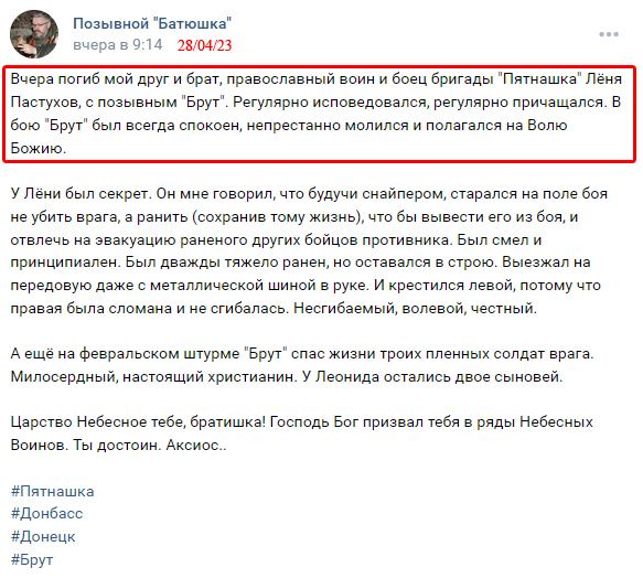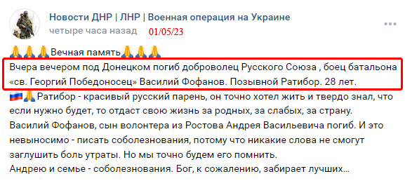 28-летний рашистский в-рот-и-бор Василий Андреевич Фофанов, по кличке "Ратибор", из Ростова-на-Дону не особо хотел жить, так что поехал под Донецк, записался в батальон "так себе победоносец" и 30/04/23 там отратиборился: показал "лося" и получил фофан в лобешник.