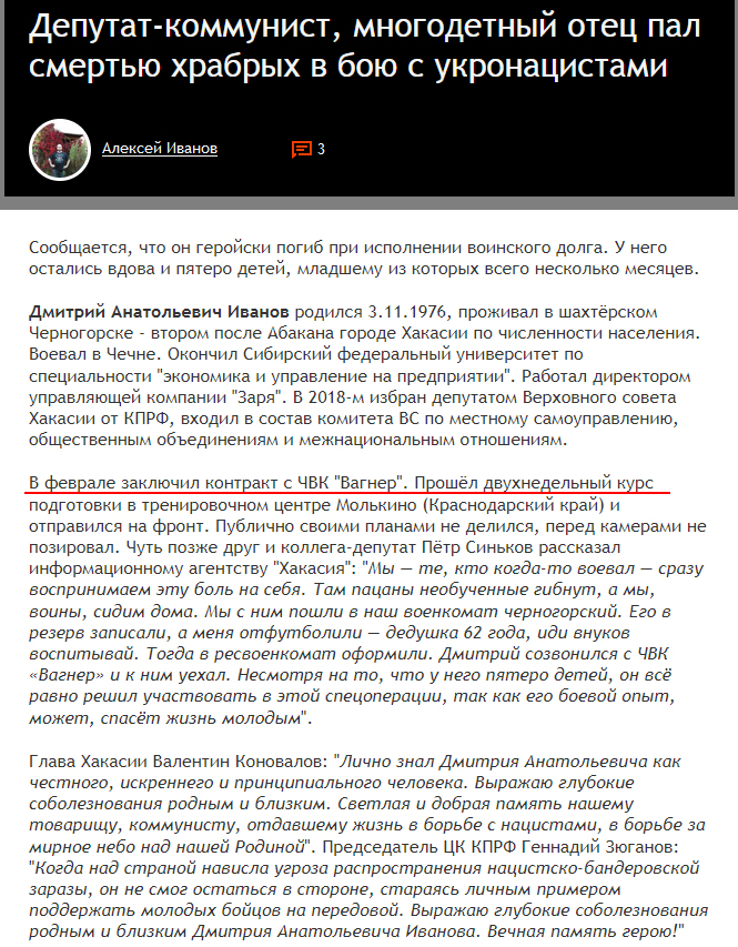 Пятидетный коммунист, член комитета по межнациональным отношениям ВС Хакасии, Дмитрий Анатольевич Иванов, 1976 г.р., из Черногорска в феврале 2023 года отправился в ОПГ Вагнер воевать вместе с нацистами и 27/03/23 контракт закончил при помощи ручной гранаты от ВСУ.